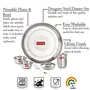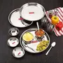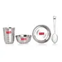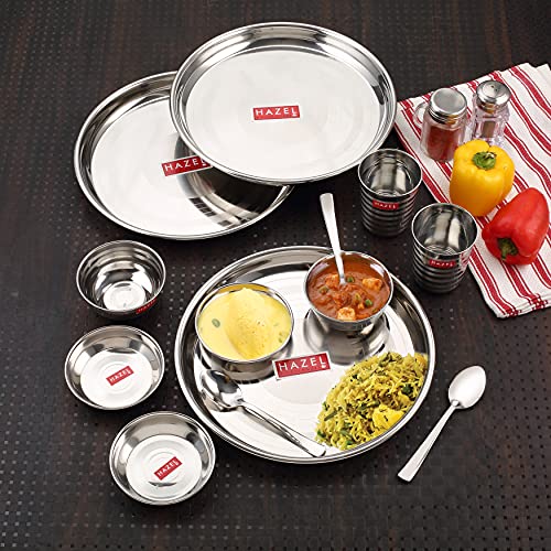 Featuring a set of 24 piece stainless steel dinner set including (4 Steel Plate 4 Steel Glass 8 Bowl 4 Spoon 4 Dessert Plate). Featuring a highly attractive design this dinner set will surely impress your lunch and dinner guests while providing a great canvas to showcase your delicious food. Apart from your own use you can also give this dinner set to your loved ones as a perfect gifting option on special occasions or festivals. Its strong and sturdy construction makes this set an ideal solution for both special occasions as well as everyday meals. Furthermore all plates spoons and bowls in this set are rust-proof and hygienic preventing contamination of your food. The individual pieces in this dinner set can be nested together and this makes them ideal to stack up and away when not being used saving valuable kitchen space. You can easily clean this dinner set with a simple detergent solution and retain its shiny looks for a long time.