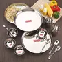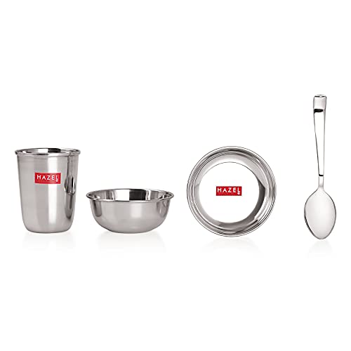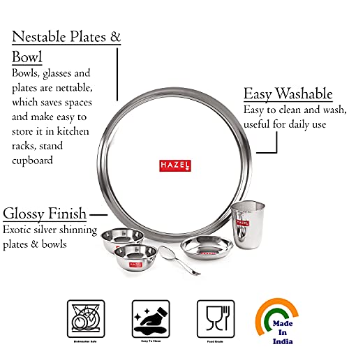 Featuring a set of 30 piece stainless steel dinner set including (5 Steel Plate 5 Steel Glass 10 Bowl 5 Spoon 5 Dessert Plate). It is very economical in range made of food grade stainless steel. It is non breakable durable sturdy rust free and long lasting. An excellent choice if you are redoing your kitchen or want to replace your current dinner set with a trendy and contemporary one. Contemporary minimalistic design to suit your refined taste. Stainless steel is hygienic to use and easy to clean as compared to other materials. This set can be nested one into another and therefore helping save shelf space in the kitchen This set is perfect for gifting purposes at weddings anniversaries. You get a magnificent dinner set at an extremely affordable price.