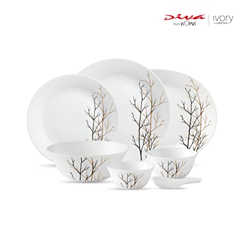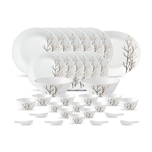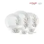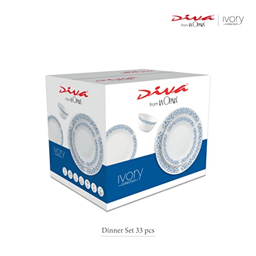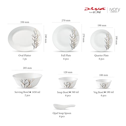 Infuse your dining table with a touch of abstract art when you use this beautifully designed dinner set. Each piece has been designed to give a handcrafted feel and then finished with delicate pattern lending colour and personality to this modern design. Wherther you are moving into a new home or simply refreshing your dinnerware this 33 piece dinner set makes for a gorgeous choice. This dinner set includes 1 rice plate 6 full plates 6 quarter plates 6 soup bowls 6 veg bowls 6 soup spoons 2 serving bowls and 2pc salt and pepper set. (1pc Round Rice Plate- H-3.0cm 28.0cm Top Dia W-480gm 6pcs Full Plate : H-2.5.0cm 25.5.0cm Top Dia W-430gm 6pcs Quarter Plate : H-1.5cm 18.0cm Top Dia W-200gm 2pcs Serving Bowl : H-6.5cm 17.5cm Top Dia W-285gm 850ml Capacity 6pcs Soup Bowl : H-5.0cm 11.5cm Top Dia W-135gm 270ml Capacity 6pcs Veg. Bowl : H-4.3cm 10.cm Top Dia W-115gm 175ml Capacity 6pcs Soup Spoon : H-1.5cm L-4.3cm W-13.3cm W-50gm)