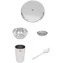 Vinod presents this silver color dinner set. It is made of stainless steel. This package contains 1 plate 1 bowl 1 small plate 1 glass and 1 spoon. It has seller warranty up to 10 years and the replacement warranty is available against manufacturing defects only.