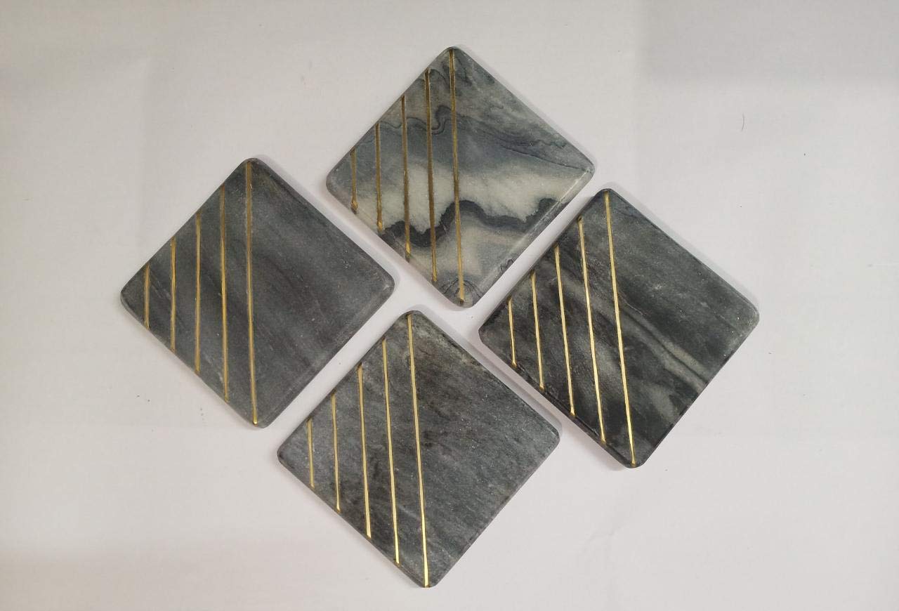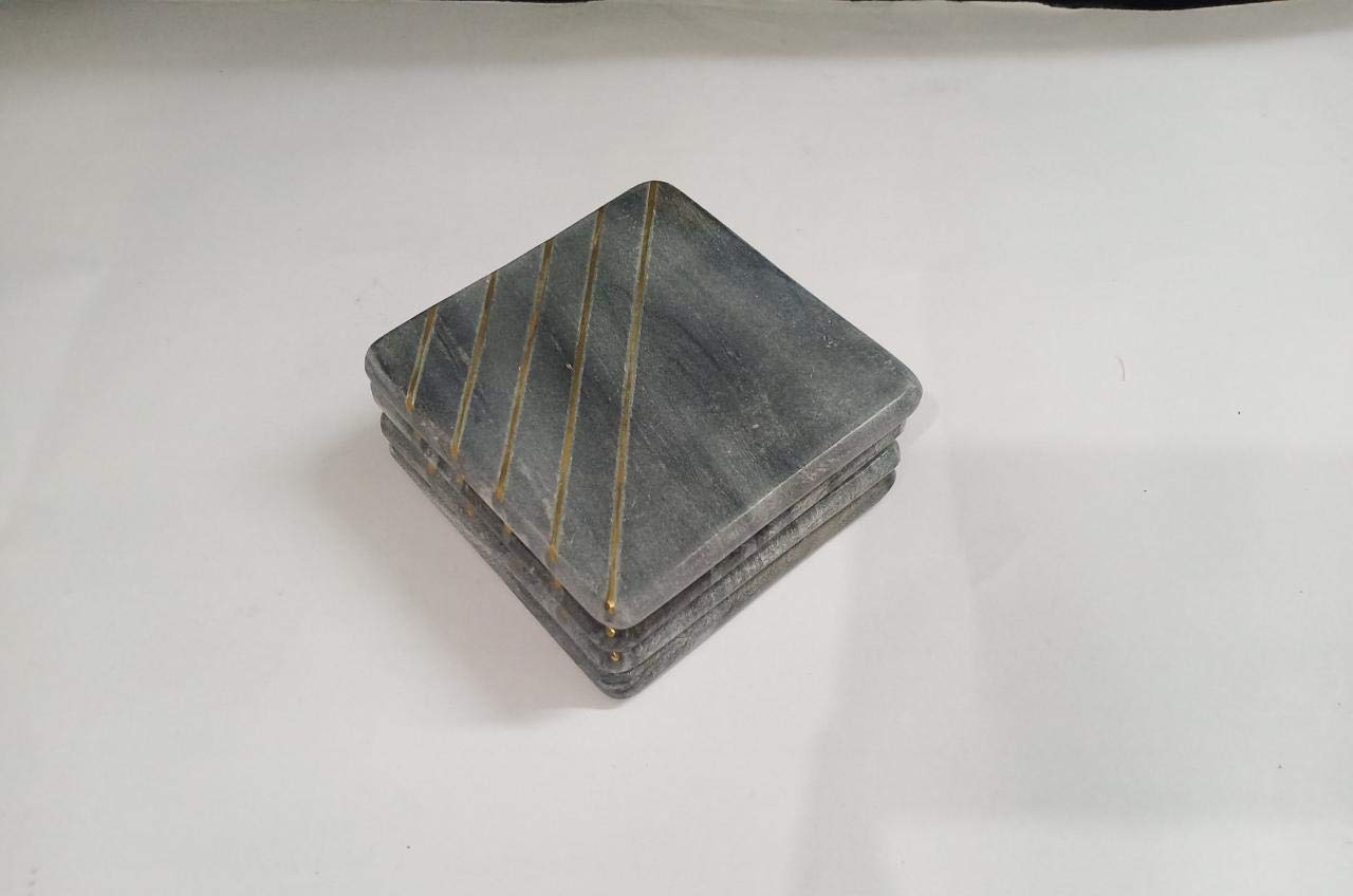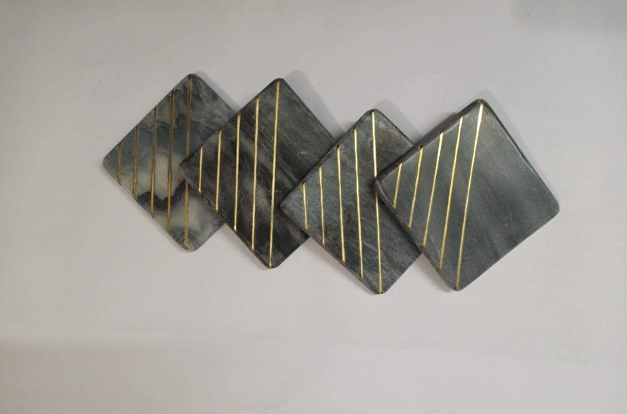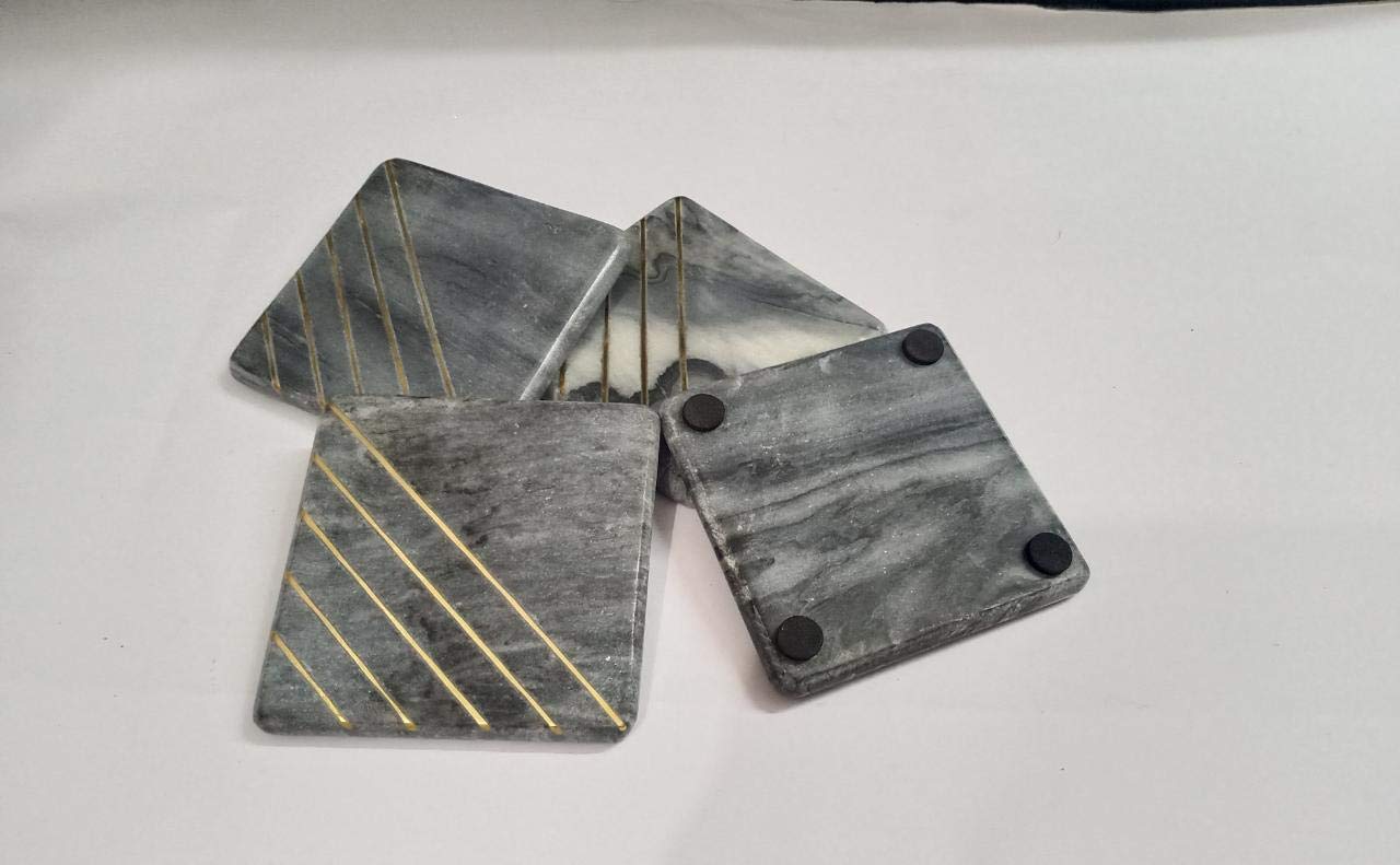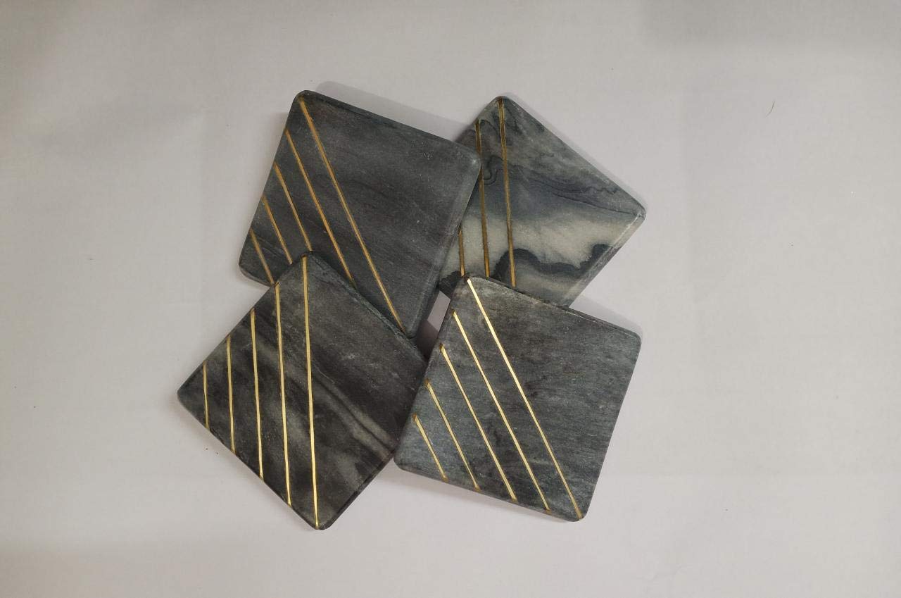 Premium Quality Marble with brass inlay s/4 pcs Coasters have been handcrafted by skilled workers. Every piece is hand inspected one by one to make sure it is in perfect shape. No need to store them away leave them for display to be admired. The natural patterns of the marble coasters gives an elegant look for your home dcor. Every piece of our stone coaster is unique in its look and pattern. They are handmade and they are padded from the bottom to protect your bar and furniture from scratches. Our coasters are thick and sturdy to last you a long time. They are easy to clean as well just wipe them with a damp cloth and leave them to dry. Being thick also means they don't easily slide around so glasses and mugs stand firmly on the coaster. 4x4 inch 10-12 mm thickness.