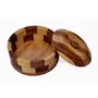 Material: Sheesham wood Color: Twin brown Finish: Teak Dimensions (cm): Diameter - 22 Height - 11 Weight: 900 g Package content: 1 Casserole Design: Running bond Style: Contemporary