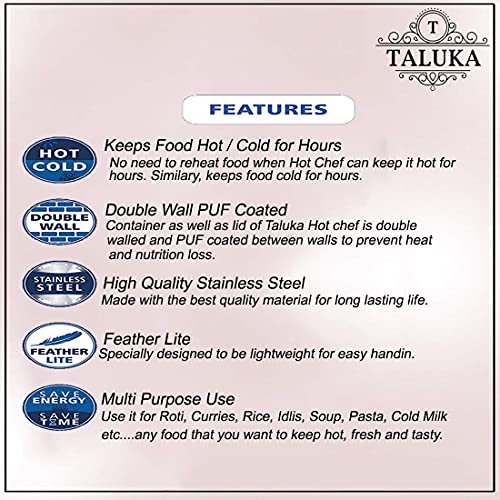 Few things matter as much as serving guests with cuisines that make them drool with delight. Hence its essential that the freshness and goodness of the food remain intact for hours. Designed from food grade stainless steel and coated with best quality polyurethane it blends beauty and strength into a winning combo. The double-walled body operates like a fortress keeping the warmth of roti softness of idlis flavour of pulavs aroma of curries and the crispiness of samosas as good as fresh. No wonder that NanoNine Hot Chef occupies a place of pride in every womans kitchen. We takes pride in bringing Innovative Products that âMakes Life Simplerâ. Taluka provides you a stainless steel insulated utensils tableware and dinnerware. The product range includes casseroles tiffins lunch boxes Tea Pots bottle set.