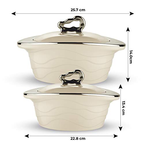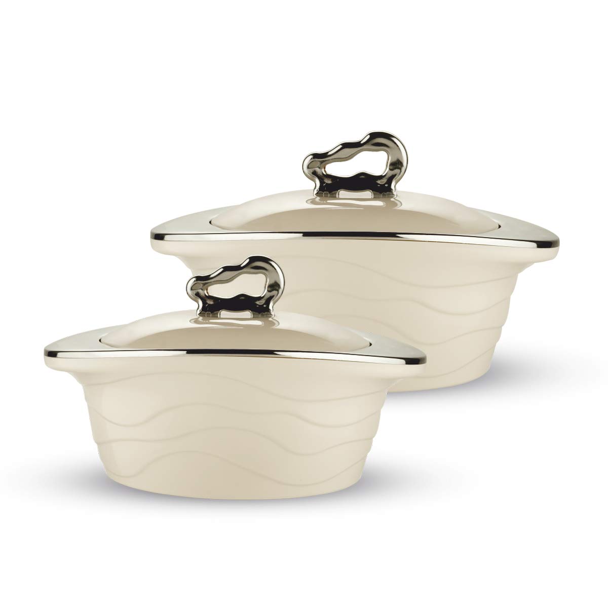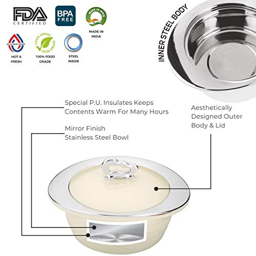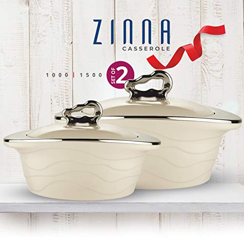 Trueware Zinna casserole meal set is made out of best materials with exquisite chromed top break safe complete product. It makes lock cover lid. The internal body is made of high grade stainless steel. The plastic external body is shaped out of virgin food grade plastic (BPA free & FDA Free). With an exceptional chrome finish it gives a modern look which is one of the standout basic in your kitchen assortments. We can purchase this item for high utility and gifting. Washing Instructions : Use mild detergent for washing. Dry thoroughly after washing. Clean the outer body with sponge instead of brush or scrub. General care : Do not attempt to separate the inner stainless steel container from its main body. Do not place the casserole over or in close proximity of fire. Tips for Optimum Use: Prior to storing hot food stuff pre-condition the casserole by pouring a little hot water rinse and empty contents. Similarly for cold articles rinse with cold water. Transfer the food into the casserole as soon as it is prepared. Store to full capacity. Do not use in Microwave ? Special P.U. Insulates keeps contents warm for many hours. ? Mirrior Finish Stainless Steel Bowl ? Aesthetically Designed Outer Body & Lid Disclaimer : Do not use any kind of hard substance or scruber to clean the inner or outer body of Casserole.