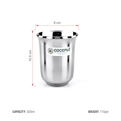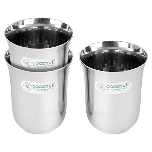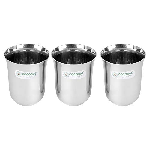 Coconut is range of innovative and products for home and kitchen. This set has been beautifully designed to add grace to your dining experience. This set is perfect for serving lemonade water juice etc. It is made from stainless steel and is absolutely durable. These Glasses can be used at home as well as at Hotels and restaurants. These can be easily cleaned and maintained.Product Content : Coconut Stainless Steel B5 Plain Water Glass - Set of 3 - Capacity - 300ML Each Glass. Diamater - Width -8Cms Height-10Cms Weight of 3 Glass - 330Gms