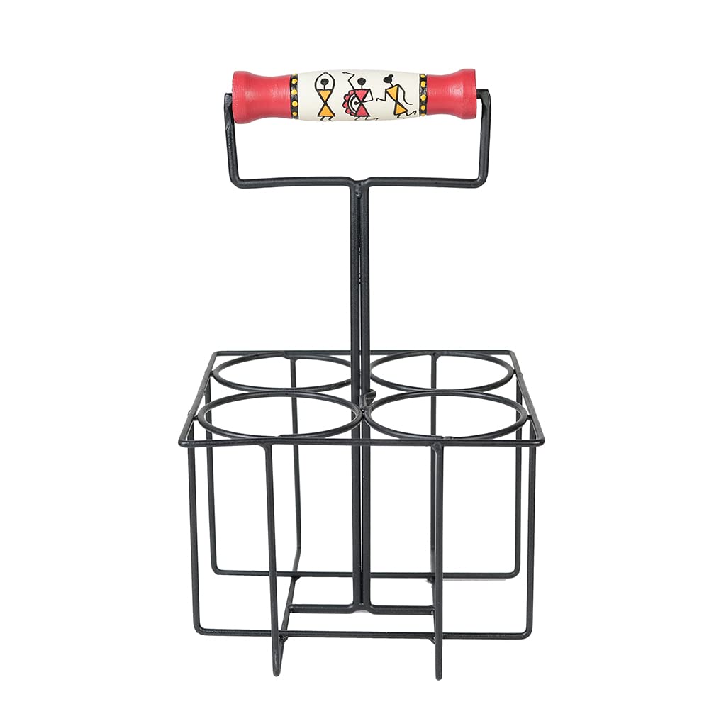 HomeKitchenServeware setsGlassesKHURJA POTTERY Warli Dancing Transparent Juice Glasses with Stand Big Glass for Mocktail Beer Lassi Glass Set for Water with Carrier Glass Organizer Set of 4 (400 ml)