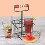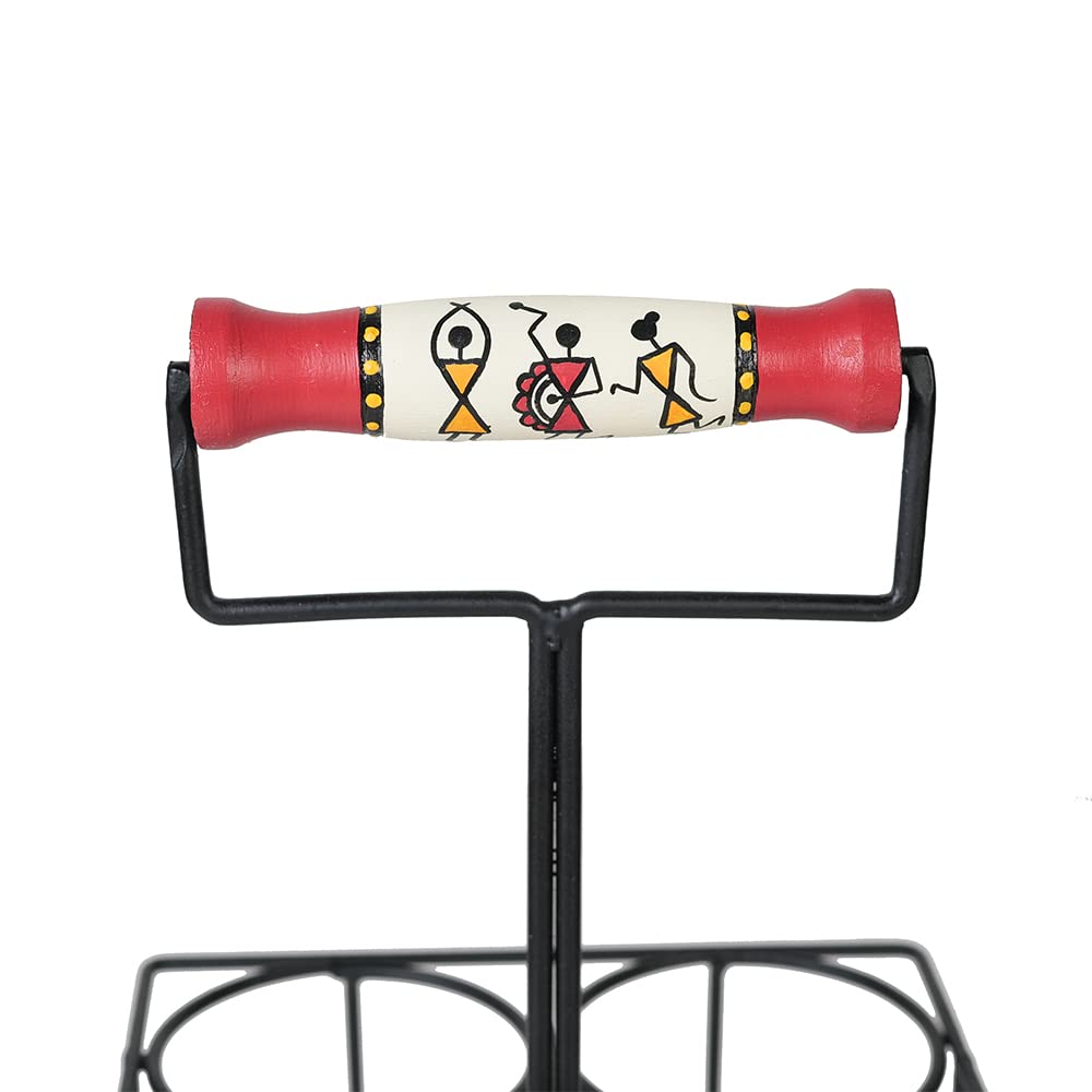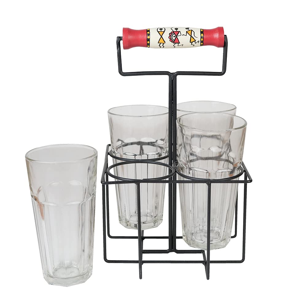 KHURJA POTTERY Warli Dancing Transparent Juice Glasses with Stand Big Glass for Mocktail Beer Lassi Glass Set for Water with Carrier Glass Organizer Set of 4 (400 ml)