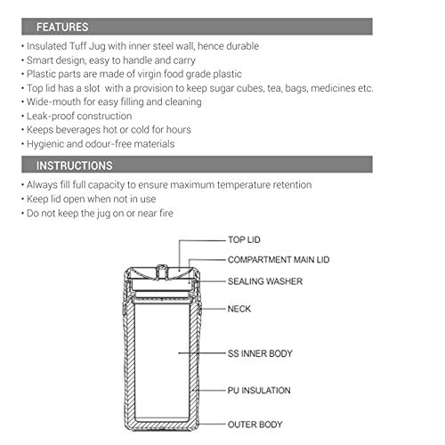 Color Name:Blue | Size:420 mlMilton is driven by a keen desire to delight its customers by offering them intelligent products. Milton brings on nostalgia about school-day tiffin meals reminds you of daily office-squabbles for hot food from your colleagues lunch boxes memories of so many houseware products that brought convenience to life then you already know who we are and what we do. Milton is one of the leading manufacturers and marketers of houseware products in the country. is the bedrock upon which our reputation rests we rigorously lab-test our products. Milton have introduced other brands which are treo claro and spot zero. Stylo 500 is a sturdy insulated tuff jug that keeps liquid hot or cold for hours. It provides a smooth hassle-free pour with a simple threaded lid that allows smooth flow of the liquid through wide mouth. It is always advisable to fill full capacity to ensure maximum temperature retention. Ideal product for serving soup tea coffee chaans sambar etc. Stylo 500 is insulated tuff jug with inner steel wall which makes it durable and smart design. It is easy to handle. Plastic parts are made of virgin food grade plastic top lid has a slot with a provision to keep sugar cubes tea bags medicines etc. Stylo 500 tuff jug has wide mouth for easy filling and easy cleaning it is leak-proof. Made of hygienic and odor-free material. Instructions for dishwasher use: Wash jug in normal wash cycle. Keep tiffin upside down on top rack for better cleaning. Do not wash tiffin in intense dishwashing cycle. Do not use lemon-scented detergent which will reduce the tiffin surface shining. Use sponge instead of brush to clean the outer body. Use sponge instead of brush to clean the outer body.