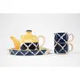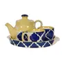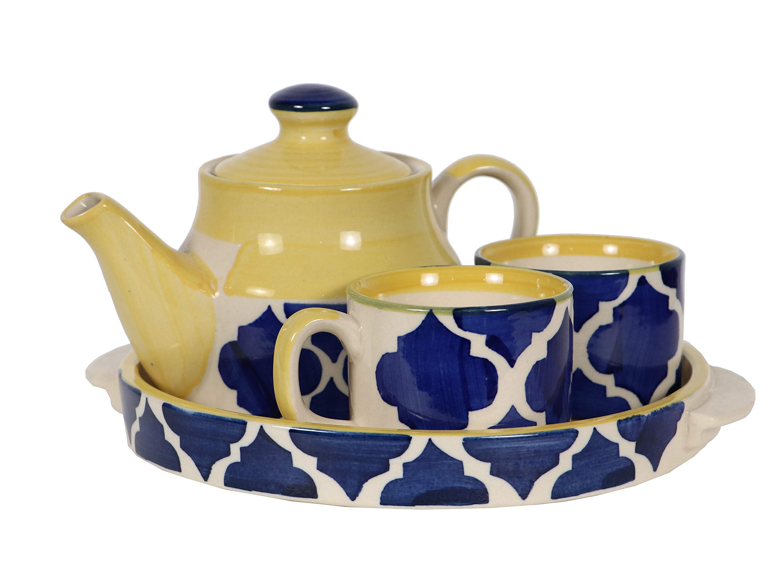 HomeKitchenServeware setsKettleKHURJA POTTERY Microwave Safe Hand Made Painted Ceramic Tea Set with Kettle (Tea Pot) and 2 Cup Capacity of 150 ml Blue & Yellow