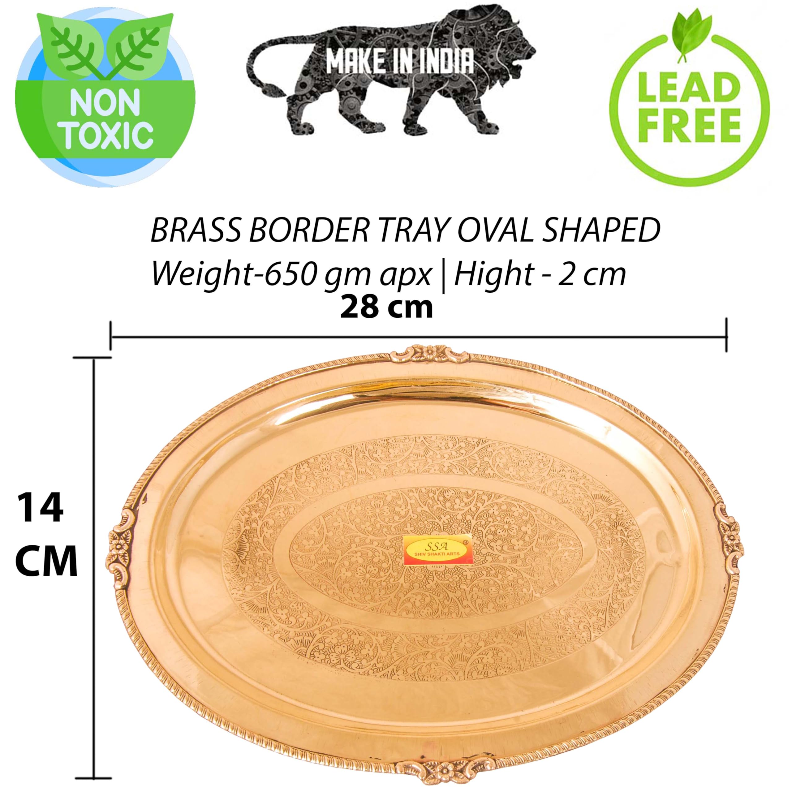 Add a touch of Mughlai elegance to your serving experience with our Brass Tray. This oval-shaped tray features an exquisite embossed finish with decorative borders making it a perfect choice for both home and hotel settings. Ideal for serving purposes this tray combines functionality with antique kitchen charm and home decor appeal. Handcrafted from pure brass it exemplifies the rich tradition of Mughlai craftsmanship. Since 2015 Shiv Shakti Arts has been committed to producing high-quality ISO-certified brassware and spiritual items. Enhance your serving collection with the timeless beauty and practicality of our Brass Tray.
