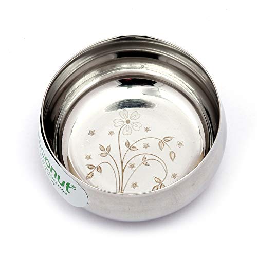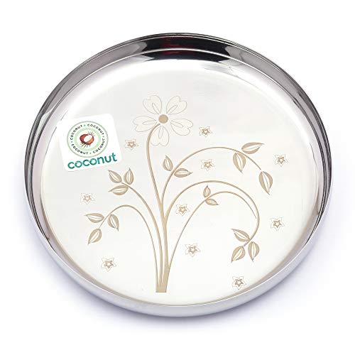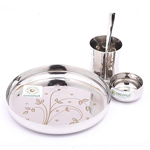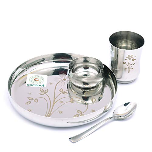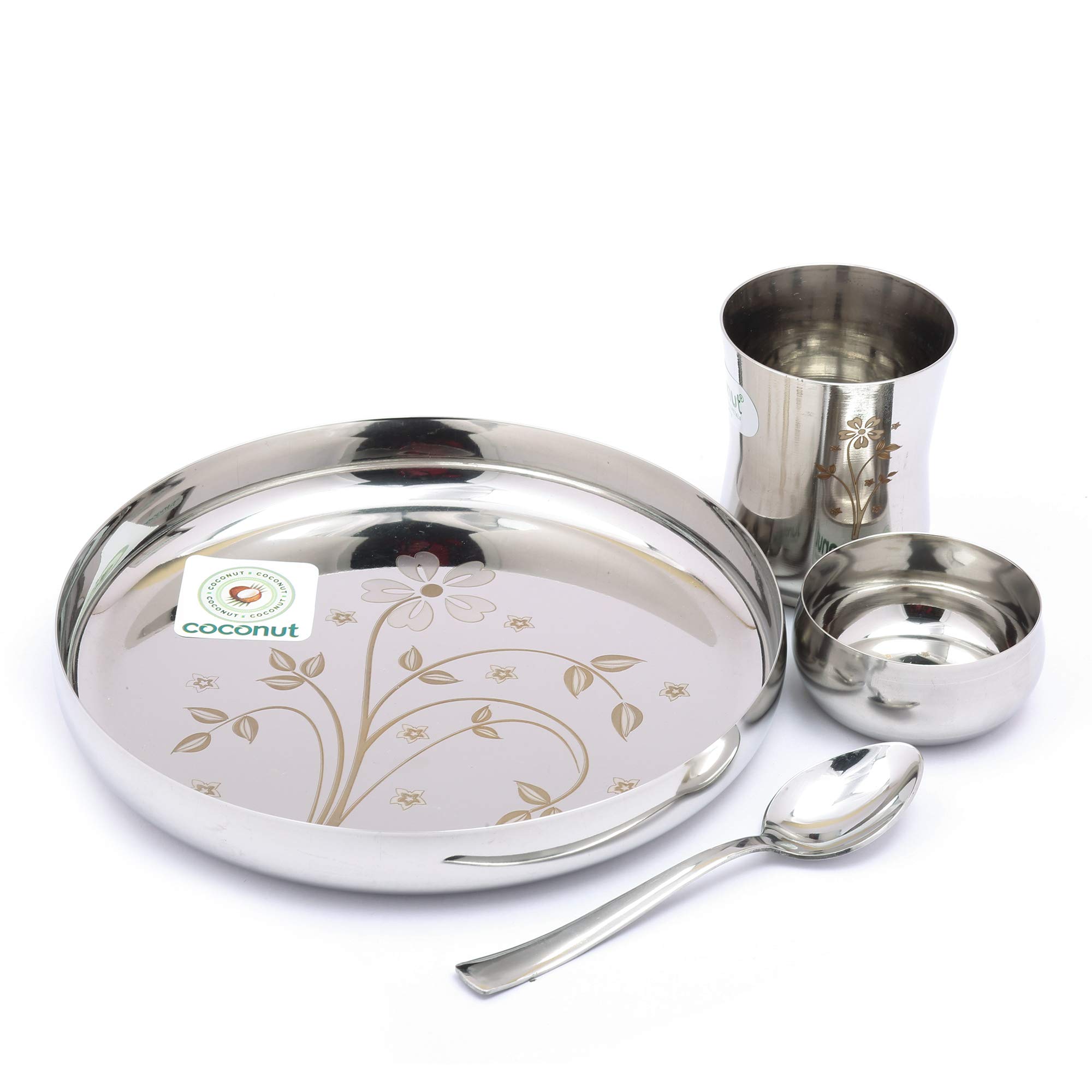 Coconut Stainless Steel Kids Laser Dinner Set (1-Plate,1-Glass, 1-Bowl & 1- Spoon) 4 Pieces - Silver, Diameter - 7.5 Inches