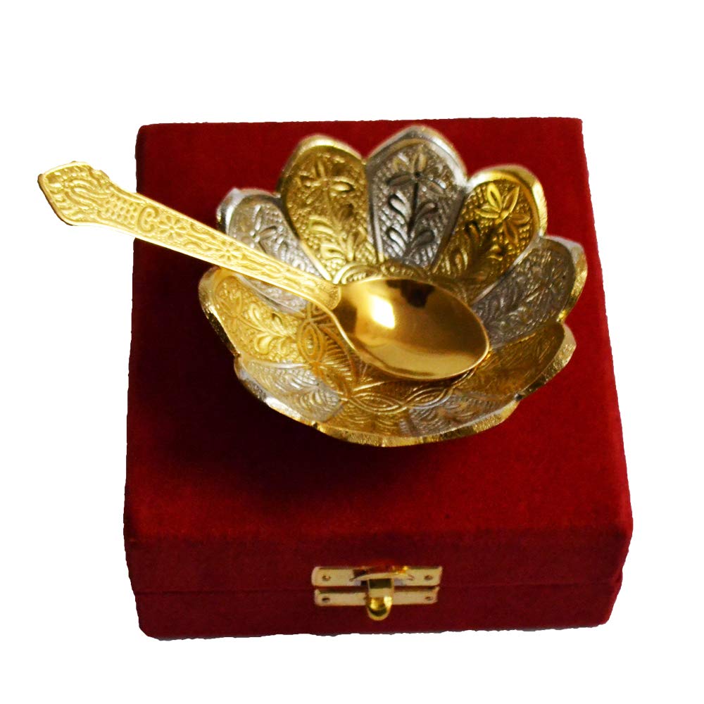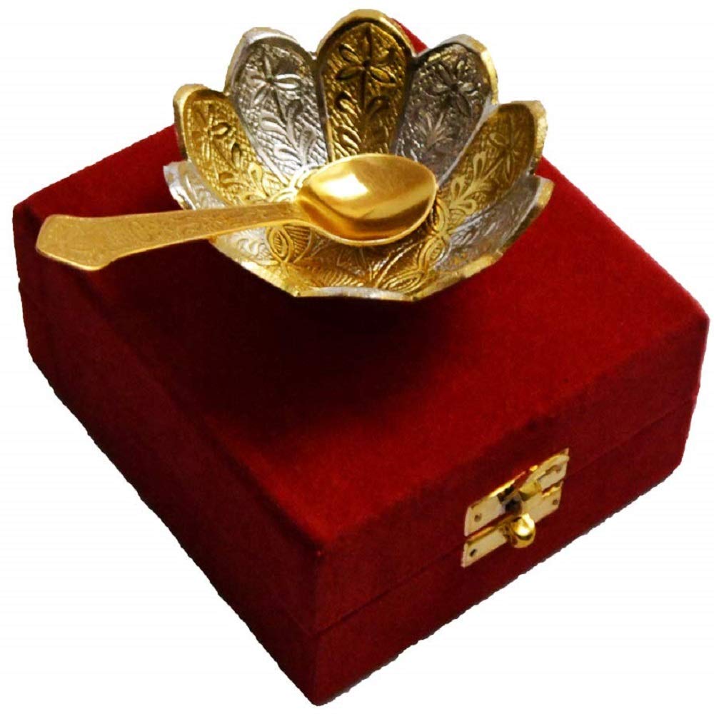 HomeKitchenServeware setsBowlRAJASTHANI METAL HANDICRAFTSSilver Gold Plated Floral Shape Decorative Spoon and Bowl Set for Diwali Gift Set | Set of 2 Items-Bowl and Spoon