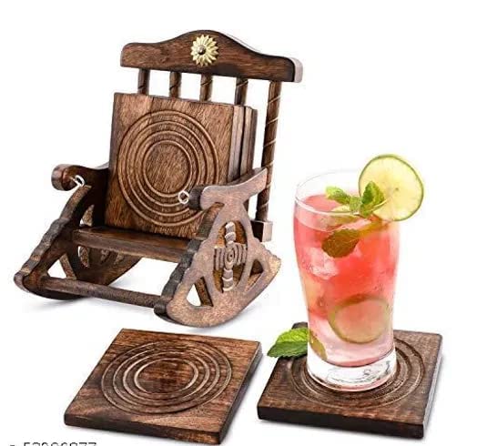 WOOD CRAFTS OF RAJASTHAN Wooden Antique Miniature Chair Shape TeaCoffeeDrink hot/Cold Coaster Set with 6 Coaster for Kitchen/Dining Table/Office/Restaurant.