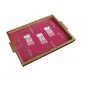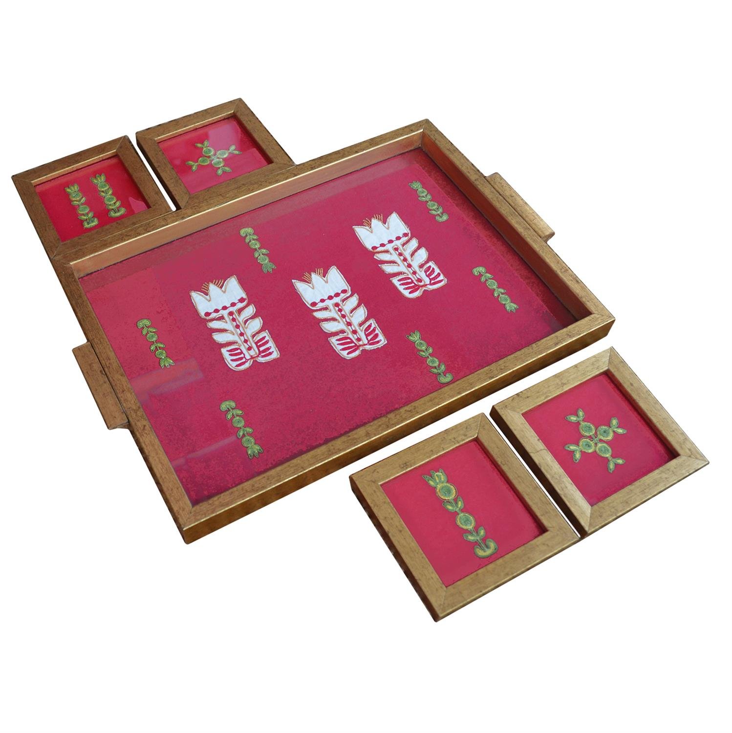 A STRIKING GRAPHIC IMAGERY INSPIRED BY THE TRIBAL ART STYLES IN MADHYA PRADESH AND RAJASTHAN THE FLORAL TREATMENT IN THE TEXTILE INSERT OF THIS WOODEN TRAY AND COASTER SET WITH GLASS TOPS IS A PERFECT AMALGAMATION OF RUSTIC AND MODERN.