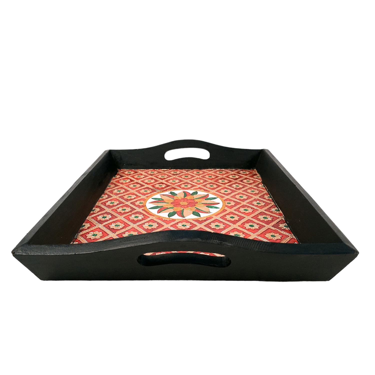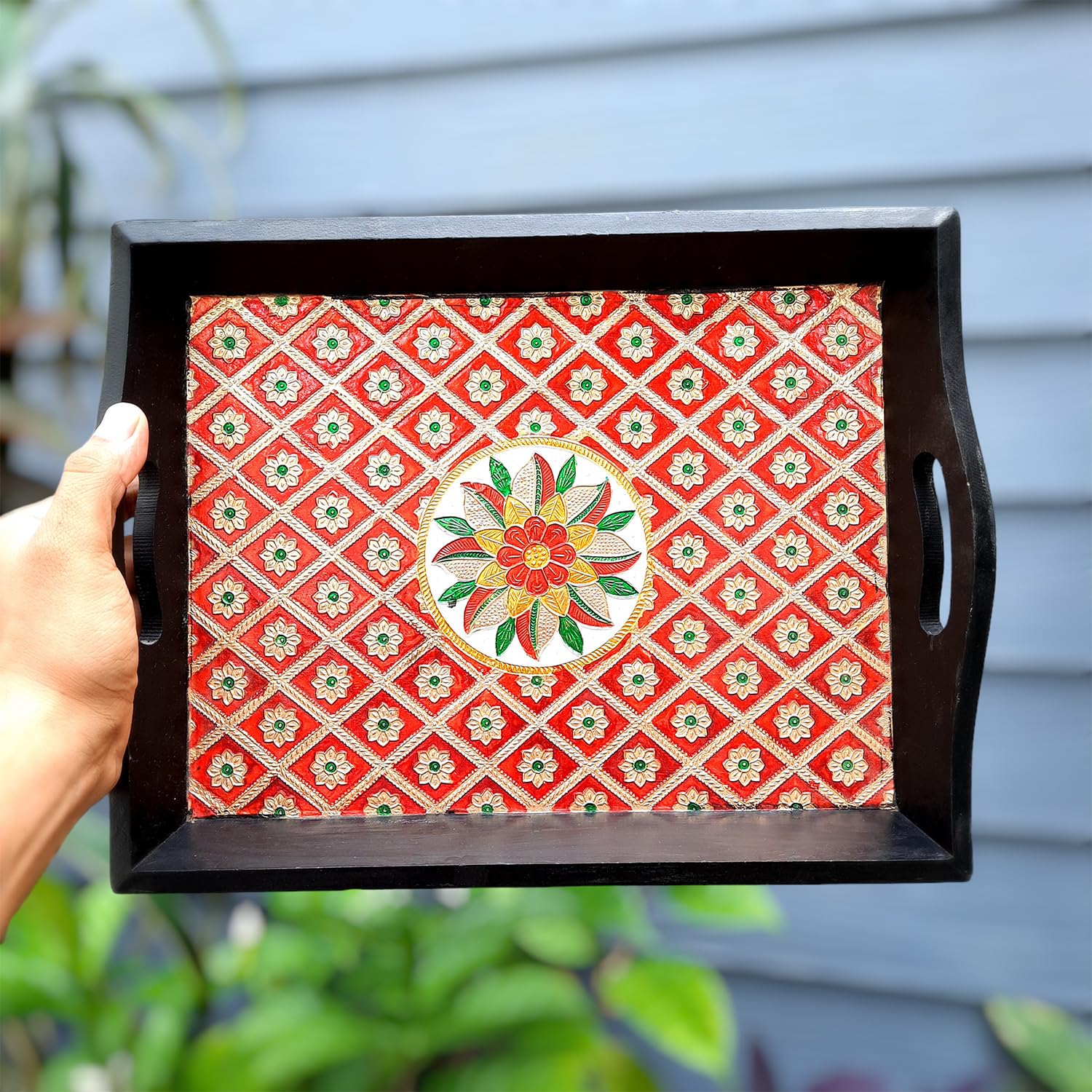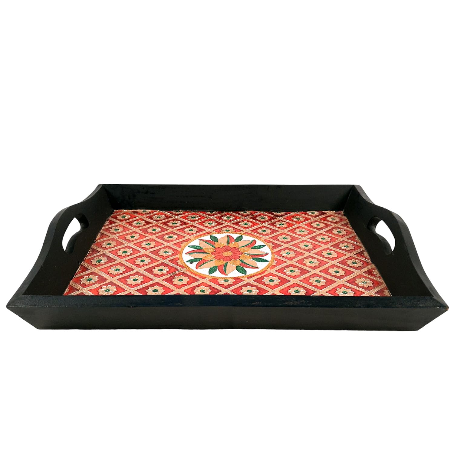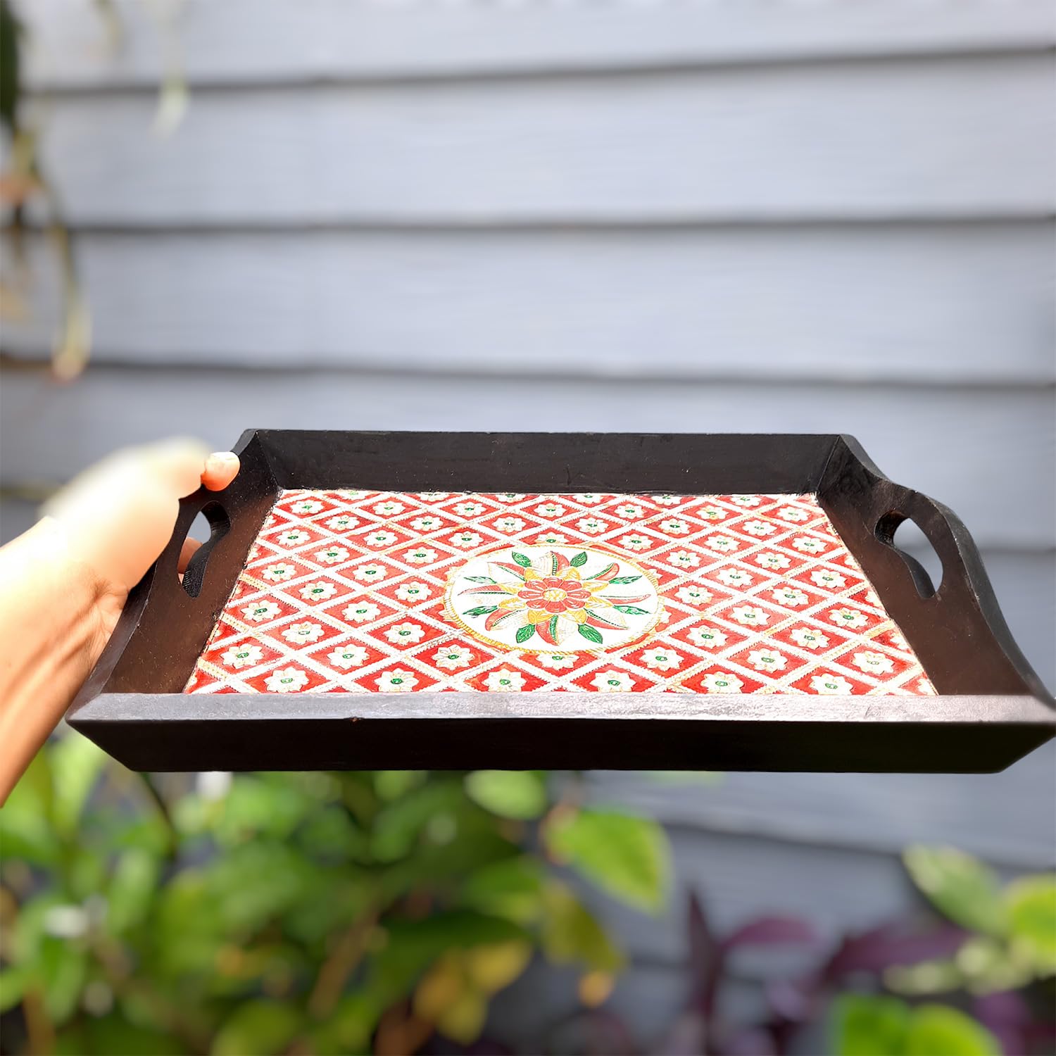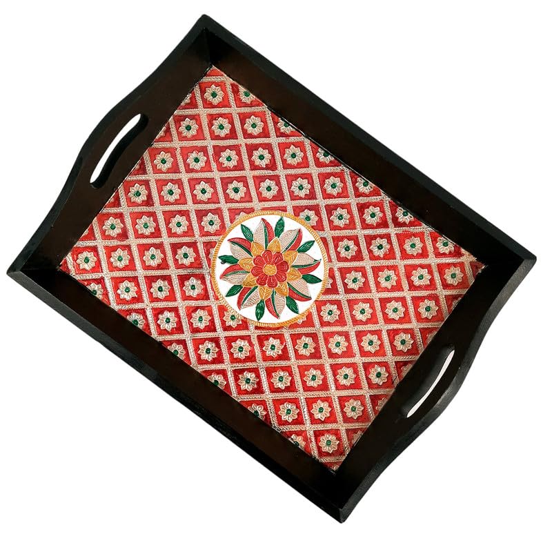 Handcrafted Wooden Serving Tray: Elevate your dining experience with our handcrafted wooden serving tray with meenakari design. This decorative platter is perfect for serving breakfast in bed tea and coffee in the kitchen or snacks in the office. Its vintage design adds a touch of elegance to any setting making it an ideal choice for home decor or as a thoughtful gift for weddings and housewarmings. Crafted with care this wooden organizer is both functional and stylish providing a charming addition to your dining table. Enjoy the warmth of wood in every serving with this versatile tray.