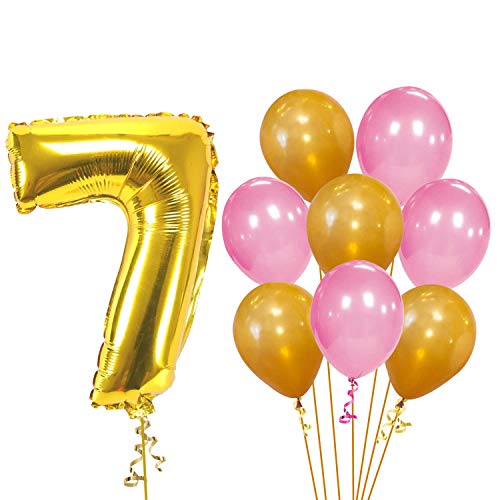 Color:Number 7 | Size:Set of 9Package include 1pc number one golden foil balloon 4pcs pink and 4pcs gold latex balloon. High Quality party supplies set for all of the ages. These balloons are good combinations to have a convenient yet impressive party decoration for everyone. Number 1 foil balloon high Quality Foil Balloon is thickened It can be used repeatedly automatic sealing. Please be gentle and careful when inflate the balloons not too much air and dont be too fast especially using a pump. Do not put the decorations close to the fire.