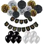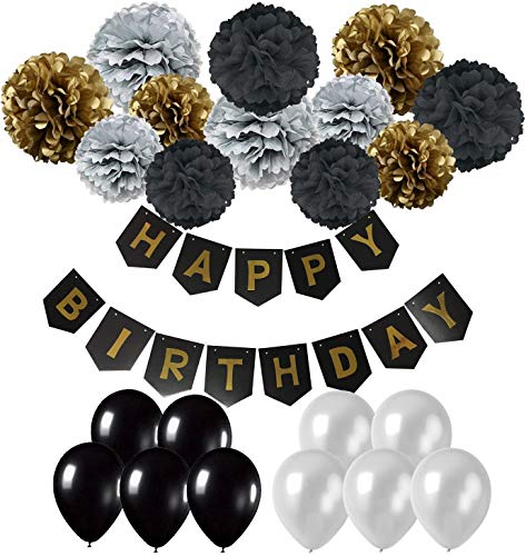 Includes: 13 black flags band ("HAPPY BrthDAY") 3 x black paper pompoms 3 x silver paper pompoms 3 x gold paper pompoms 10 x black balloons and 10 x silver balloons Brthday party supplies;