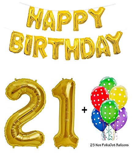 Number 21 Gold Foil Balloon and 25 Nos Polka Dotted Multi Coloured Latex Balloon and Happy Brthday Gold Foil Balloon Combo