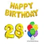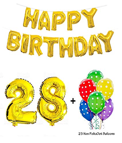Number 28 Gold Foil Balloon and 25 Nos Polka Dotted Multi Coloured Latex Balloon and Happy Brthday Gold Foil Balloon Combo