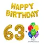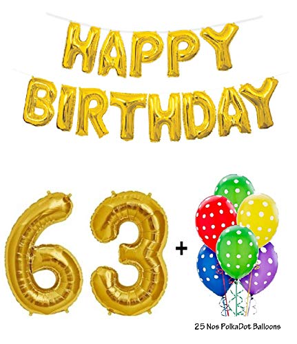 Number 63 Gold Foil Balloon and 25 Nos Polka Dotted Multi Coloured Latex Balloon and Happy Brthday Gold Foil Balloon Combo