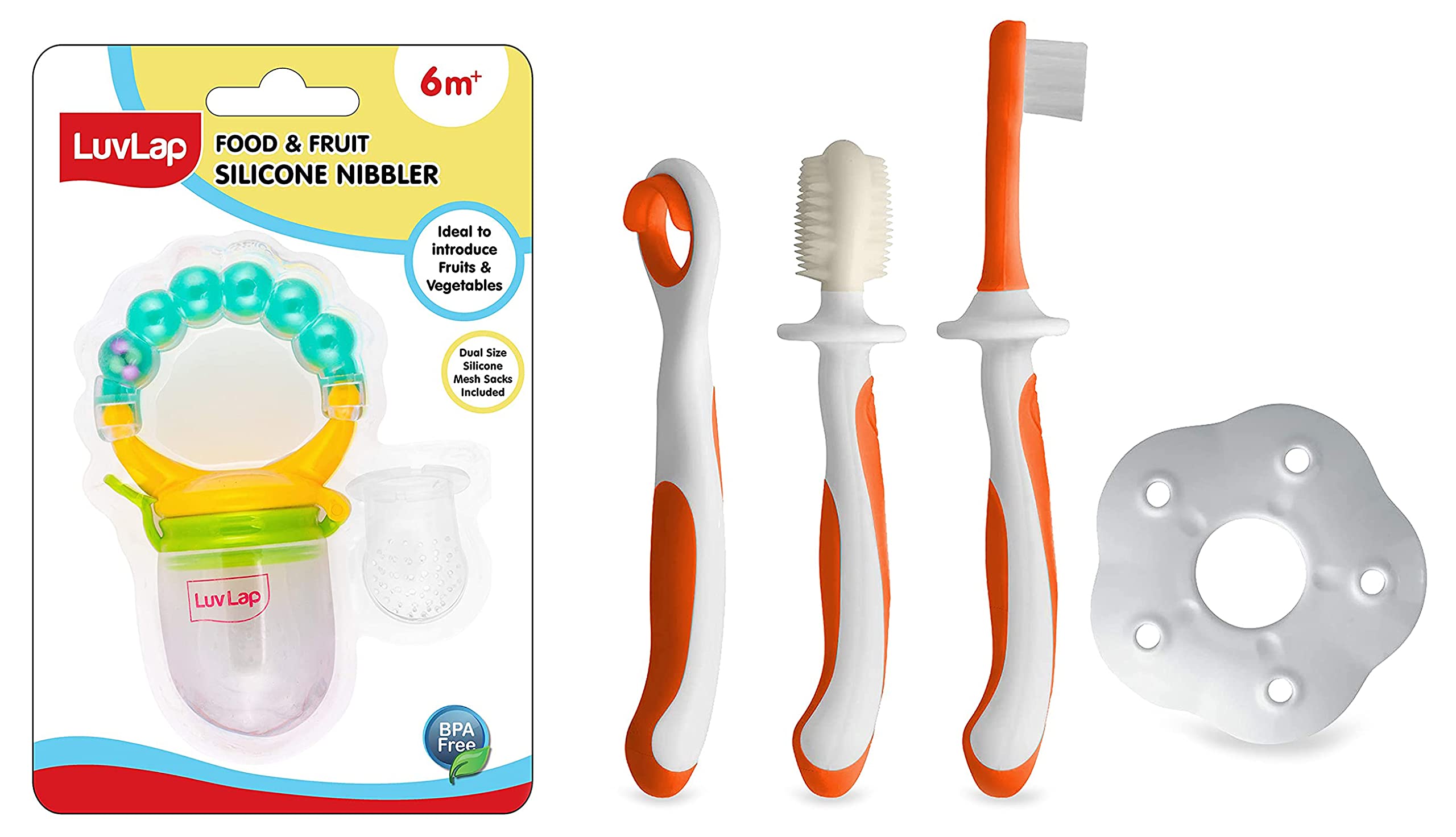 LuvLap Pearly Food & Fruit NibblerFruit nibbler and teething toy to provide gentle relief to gums. Serves dual purpose of feeding fruit and vegetables to babies and can also be used as a teether. Can be filled with chilled fruits/vegetables to provide added relief. Made with bpa free food grade plastic and soft silicone it comes in attractive handle designs to EN gage the baby and is easy to hold and nibble uponLuvLap Baby Training Toothbrush Set with Anti Choking Shield Teeth Tongue Cleaner Baby Oral Hygiene 3 pcs (White/Orange)Lifes little stories bloom with coming of the little one in your life. It completes your life with many joys of parenthood. For baby its the next best thing to being in your arms. Entertain your little one and give him or her a personal resting place. Luvlaps high chairs cots walkers and other indoor products will have the whole household floored by babys happy smiles and chuckles. At Luvlap we endeavour to weave the little stories into our products with an emphasis on child safety and enrichment of features. So that your little one gets the comfort thats next only to the warmth of your lap. Conceived with care and made using the latest marvels of science all Luvlap products undergo multiple quality checks before they are dispatched to the stores. The products are available at all leading baby gear and online stores and conform to the european standards.