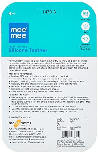 As your baby grows you will watch him/her try to chew on plenty of things to soothe his/her gums. Mee Mee multi-textured silicone teether not only provides gentle respite to the gums but also has a textured surface that provides the requisite amount of oral stimulation to your baby for enhanced gums development.