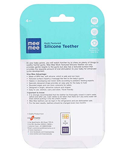 Mee Mee silicone teethers are carefully made to the highest safety standards. They are specially designed for use during baby's teething phase. Soothing for baby's gums during teething phase Provides a cooling and comforting effect to baby's sore gums Non-toxic and no sharp edges Conforms to safety standards Easy to hold Easy to clean store no sterilization needed.