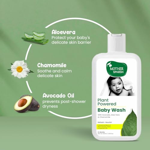 Mother sparsh plant powered natural baby wash is specifically designed to cleanse the baby's sensitive skin making it look soft and smoother afterward. Formulated with the goodness of chamomile oil avocado oil and coconut-based cleanser which are some good moisturizers as well as exfoliates the babys skin and also help in preventing post-shower dryness. Also it has no harmful chemicals such as silicon parabens dyes etc. Along with a tear-free formulation and natural fragrance which makes it completely safe to use on your precious baby.