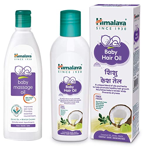 Himalaya Baby Massage Oil (200ml)Promotes Baby's General Growth and Development Improve you little one's general growth and development the Himalaya Herbals baby massage oil 200 ml. Infused with olive oil and winter cherry extracts this Himalaya Herbal oil will nourish protect and soften your baby's skin. The olive oil content which is enriched with Vitamin E protects your baby's skin from chafing. This oil also helps in strengthening your baby's nails and softening cuticles. Enriched with winter cherry this Himalaya baby massage oil has a calming effect on your baby and helps in enhancing your child's skin tone as well. Healthy and Glowing Skin for Your Baby This Himalaya massage oil is sure to provide your baby with healthy and glowing skin. Clinically tested this mild massage oil can be safely used on newborn babies. You can use this light oil to either massage your baby before bath or to moisturise your little one's skin after bath. For best results massage your child with this Himalaya baby oil at least half an hour before bath time. Use this oil on a regular basis to prevent skin dryness. Buy the Himalaya baby massage oil 200ml online to ensure that your baby's skin remains nourished at all times. Ideal for: Nourishing skin and massaging Age: Newborn and up Contains: Olive oil and winter cherry extracts Clinically tested to be mild Content: 200 mlHimalaya Baby Hair Oil 100 mlAbout Himalaya Baby Hair Oil: Himalaya Baby Hair Oil is specially formulated for babies and is designed to nourish scalp and hair. Infused with a blend of oil and herbs Himalaya Baby Hair Oil helps promote hair growth nourish hair and prevent dryness and keeps the scalp moisturized. Benefits of Himalaya Baby Hair Oil Infused with the goodness of Amla Bhringaraja Gotu kola and Methi which are known to promote hair growth and luster Enriched with the nourishing oils of Coconut Sesame Almond and Olive Helps nourish scalp and hair Moisturizes dry and itchy scalp Free from mineral oil alcohol parabens synthetic color and phthalates Dermatologically tested clinically tested Non-sticky and non-staining