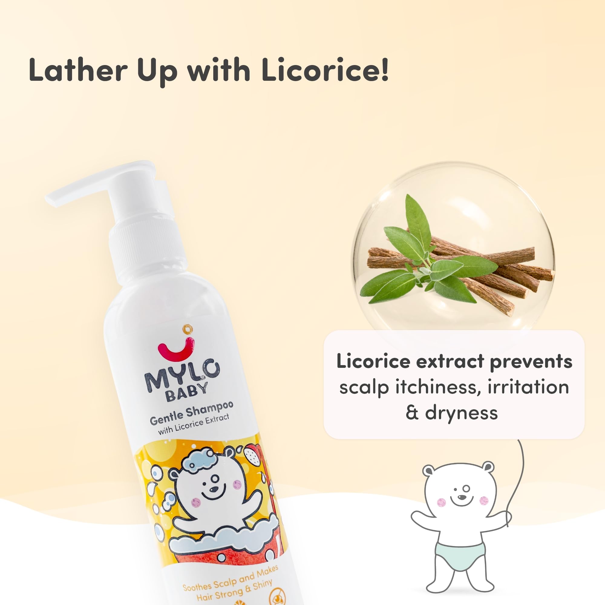 Baby scalp is very delicate and they have sensitive skin that requires special care & attention. Mylo Baby Shampoo is especially formulated with a balanced pH of 5.5 that is similar to the natural pH of a baby's skin & doesnât strip away the natural oils that protect & moisturize. It is free from harmful chemicals dermatological tested & Made Safe Certified ensuring your baby's safety and comfort for an every day wash without worrying. Our safe & toxin-free baby shampoo is enriched with powerful ingredients such as licorice extract and cucumber which prevent scalp itchiness irritation & dryness. Cucumber extract present in this baby shampoo for new born boosts hair growth and makes the hair stronger and shinier. Our baby shampoo has a tear-free formulation and hence is suitable for everyday use for babies in all seasons & for all skin types right from your baby's first day! It gently cleanses the scalp.