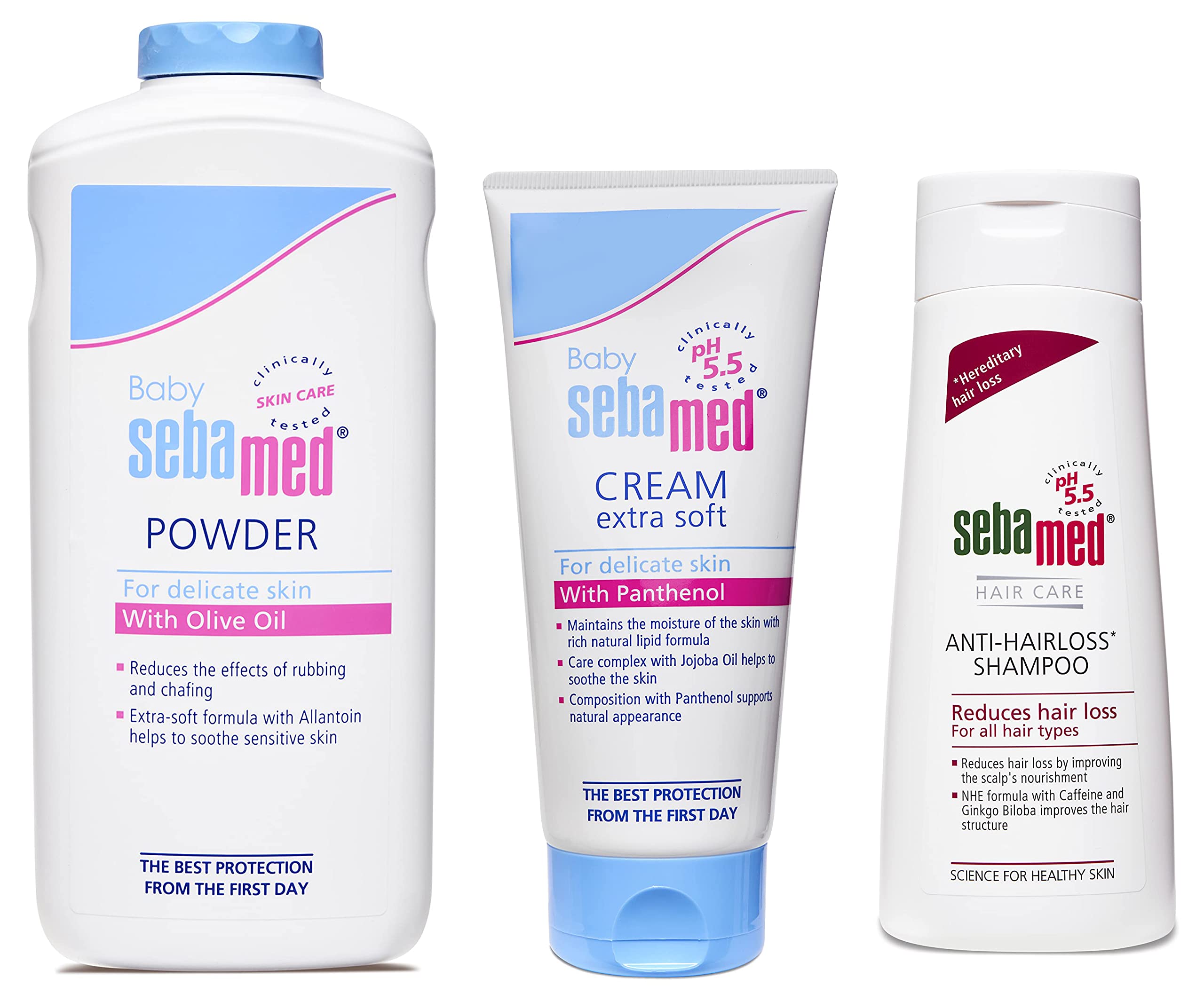 Sebamed Baby Powder 200g & Anti- Hairloss Shampoo 200ml|PH 5.5|Reduces hairloss|Caffeine&Gingko Biloba|All hair types & Baby Cream Extra Soft 50m|Ph 5.5| Panthenol and Jojoba Oil|Clinically tested