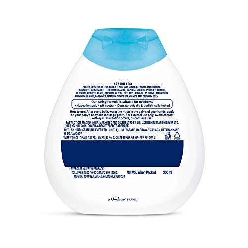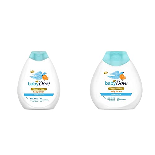 Baby Dove Rich Moisture Nourishing Baby Lotion (200ml)The best lotion for babies should give the gentle nourishing care their delicate skin needs. Bathing can lead to skin dryness so use Baby Dove Rich Moisture Baby Lotion to help replenish the essential moisture in your baby skin. For upto 24 hours it moisturizes and replenishes your baby precious skin barrier. The product is made with 100% skin-natural nutrients for delicate baby skin (contains nutrients that are 100% identical to those naturally found in skin) From the very first use this lotion for baby soothes and hydrates to provide moisture for your baby skin and it dermatologist and pediatrician tested so you can feel safe in the knowledge that your baby skin is getting the extra special care it deserves. Plus the gentle hypoallergenic and pH neutral formula of this Baby Dove baby body lotion is suitable to use even on your newborn. Baby Dove Rich Moisture lotion formulation is free from added Parabens Dyes and Phthalates and completely safe to be used on Baby delicate skin. Buy now! Use Baby Dove Rich Moisture Baby Lotion after bath time to moisturize your little one delicate skin while leaving it super soft and ready for snuggles when used with Baby Dove Tip to Toe Rich Moisture Baby Wash followed by Baby Dove Body lotion.Baby Dove Rich Moisture Nourishing Baby Lotion 400mlAs a parent you know that baby's skin needs extra special care. But did you know that after every bath baby's skin can lose moisture up to 5 times faster than yours? The best lotion for babies should give the gentle nourishing care their delicate skin needs. Bathing can lead to skin dryness so use baby dove rich moisture baby lotion to help replenish the essential moisture in your baby skin for up to 24 hours. It moisturizes and replenishes your baby precious skin barrier. From the very first use this lotion for baby soothes and hydrates to provide moisture for your baby skin and it dermatologically and pediatrically tested so you can feel safe in the knowledge that your baby skin is getting the extra special care it deserves. Plus the gentle hypoallergenic and ph neutral formula of this baby dove nourishing baby lotion is suitable to use even on your new-born. Baby dove rich moisture nourishing lotion is created with no parabens no dyes and no phthalates. Use baby dove rich moisture baby lotion after bath time to moisturize your little one delicate skin while leaving it super soft delicately scented and ready for snuggles.