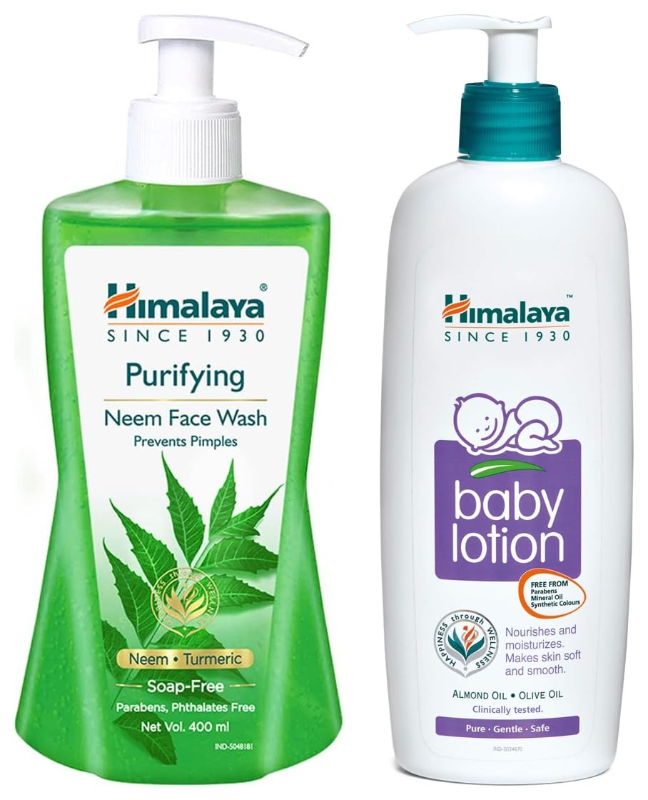 Himalaya Baby Body Lotion For All Skin Types (400 ml)Himalaya Baby Body Lotion For All Skin Types (400 ml)Himalaya Purifying Neem Face Wash 400 mlHimalaya purifying neem face wash is a soap free herbal formulation that cleans impurities and helps clear pimples. A natural blend of neem and turmeric bring together their antibacterial and antifungal properties to prevent the recurrence of acne over time. Neem is an excellent skin care ingredient known for its antibacterial properties. It improves general skin health and immunity combating bacterial infections such as acne boils and ulcers. Neem tackles bacteria from the root and prevents the recurrence of pimples and blemishes. Turmeric has been used as an antiseptic for centuries and it is regarded as one of nature's most powerful healers. The herb helps to even out your skin tone and colour making it an excellent ingredient in a face wash. It also helps to retain the skin's elasticity making it supple. Turmeric has strong anti-inflammatory properties which soothe your skin.