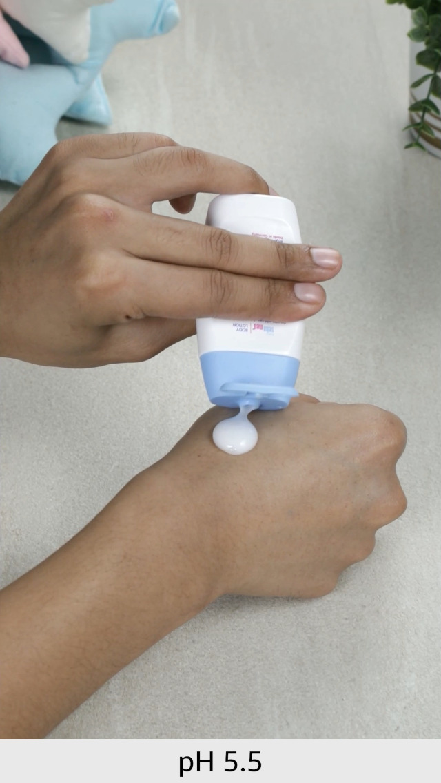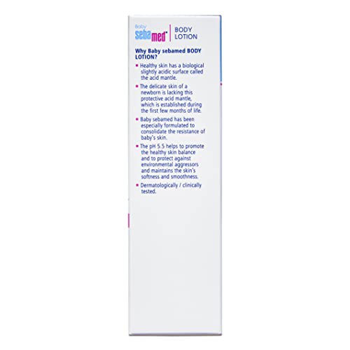 Seamed baby lotion has a ph of 5. 5 And contain natural lipids. Conventional baby lotions have ph greater 7 and contains parabens and propylene glycol which can cause burning sensation and skin irritation. Seamed baby lotion contains 7 percent natural lipids plus lecithin plus sorbitol ensures long lasting hydration. Sebamed baby lotion has easy spread ability without leaving an oily film. Made in Germany gentle protection for delicate baby skin moisturizing and emollient complex safeguard against dryness allantoin makes the skin smooth and supple chamomile soothes the skin rapidly absorbed without greasy residue7 percent lipid compound oil in water emulsion supports the natural lipid balance pleasant botanical fragrance ideal from 7 day onwards clinically proven 16 percent increase in skin hydration within 3 weeks.