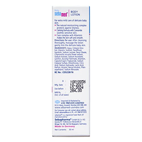 • Use Sebamed baby lotion after your baby's bath and before the baby goes to bed at night and take 2 3 ml of Sebamed baby lotion on your palm and gently massage it over entire body to soften your baby's skin. Organic : No