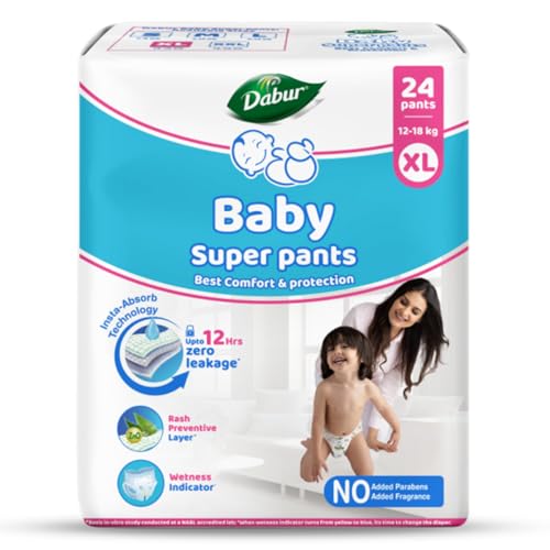 Dabur Baby Super Pants have been specially designed for baby’s delicate skin to offer leakproof skin protection. It is infused with the goodness of natural ingredients such as Aloe-vera Shea butter & Vitamin E to keep redness & rashes away. The diaper pants are designed with new five layer Insta Absorb technology for high absorbency & 12 hrs zero leakage that helps baby get a sound sleep all night long. The magic gel locks wetness & keeps baby’s skin dry and comfortable overnight. The diaper enables a comfortable fit with its 360 stretch fit design for easy wear & movement. Made of soft breathable fabric it ensures proper air circulation. Dabur Baby Super Pants are available in different sizes (small medium large XL & XXL) as per the weight of the baby.