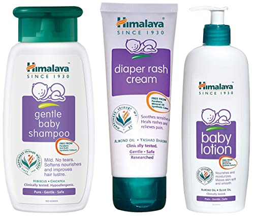 Himalaya Baby Body Lotion For All Skin Types (400 ml)Himalaya Baby Body Lotion For All Skin Types (400 ml)Himalaya Gentle Baby Shampoo (200ml)Himalaya Gentle Baby Shampoo (200ml) Natural Care for Your Baby's Hair Himalaya Herbals baby care shampoo is enriched with natural sources of protein that leave your baby's hair soft and nourished. This gentle baby shampoo is formulated to cleanse and strengthen your little one's hair without any teary-eyed blues. It is so gentle that your tot is definitely going to love it. Himalaya shampoo is in essence a natural shampoo containing no harsh chemicals. It boasts anti-inflammatory and soothing properties to protect and care for your baby's tender scalp. All in all it is an essential baby care product that helps you get rid of dirt and other harmful infectious particles from your child's scalp without damaging it. Gentle Baby Shampoo for Healthy Baby Tresses The mild and soft Himalaya herbal shampoo moisturises and nourishes your baby's hair improving its texture. Its core ingredients include chickpea hibiscus and khus khus. The protein-rich chickpea leaves the hair strong and shiny while hibiscus acts as a natural conditioner to make it soft and smooth. Khus-khus soothes the baby's scalp with its antibacterial and antifungal properties. These natural ingredients make Himalaya baby care shampoo perfectly safe for daily use. It cleanses disinfects and leaves behind a mild scent and lustre with its ideal pH balance. Easy to use just apply this Himalaya 200ml Gentle Baby Shampoo lather and rinse well to get those shiny baby locks instantly. Brand: Himalaya Age: Newborn and up Contains: Chickpea Hibiscus and Khus khus for smooth silky hair Antibacterial and antifungal properties Hypoallergenic Paediatrician recommended Content: 200 mlHimalaya Diaper Rash Cream100gmHimalaya Diaper Rash Cream while promoting effective healing soothes red and irritated skinand forms a protective layer on baby skin.Apply Diaper Rash Cream on rashes and around the area where the diaper's edges rub against baby's skin.