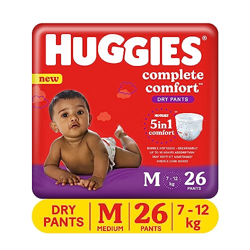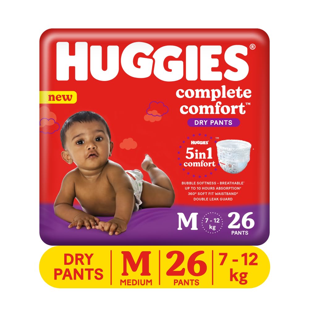 Huggies Complete Comfort Dry Pants Medium (M) Size Baby Diaper Pants, 26 count, with 5 in 1 Comfort