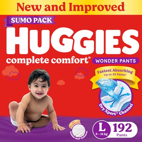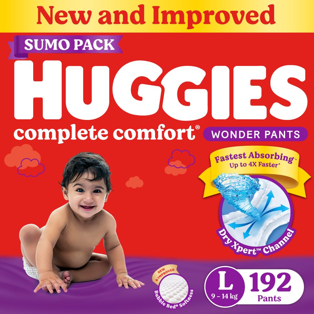 Huggies Complete Comfort Wonder Pants | Pant Style Baby Diapers L Size, 192 Count | India's Fastest Absorbing Diaper, Patented Dry Xpert Channel, Ideal for 9 to 14 Kgs