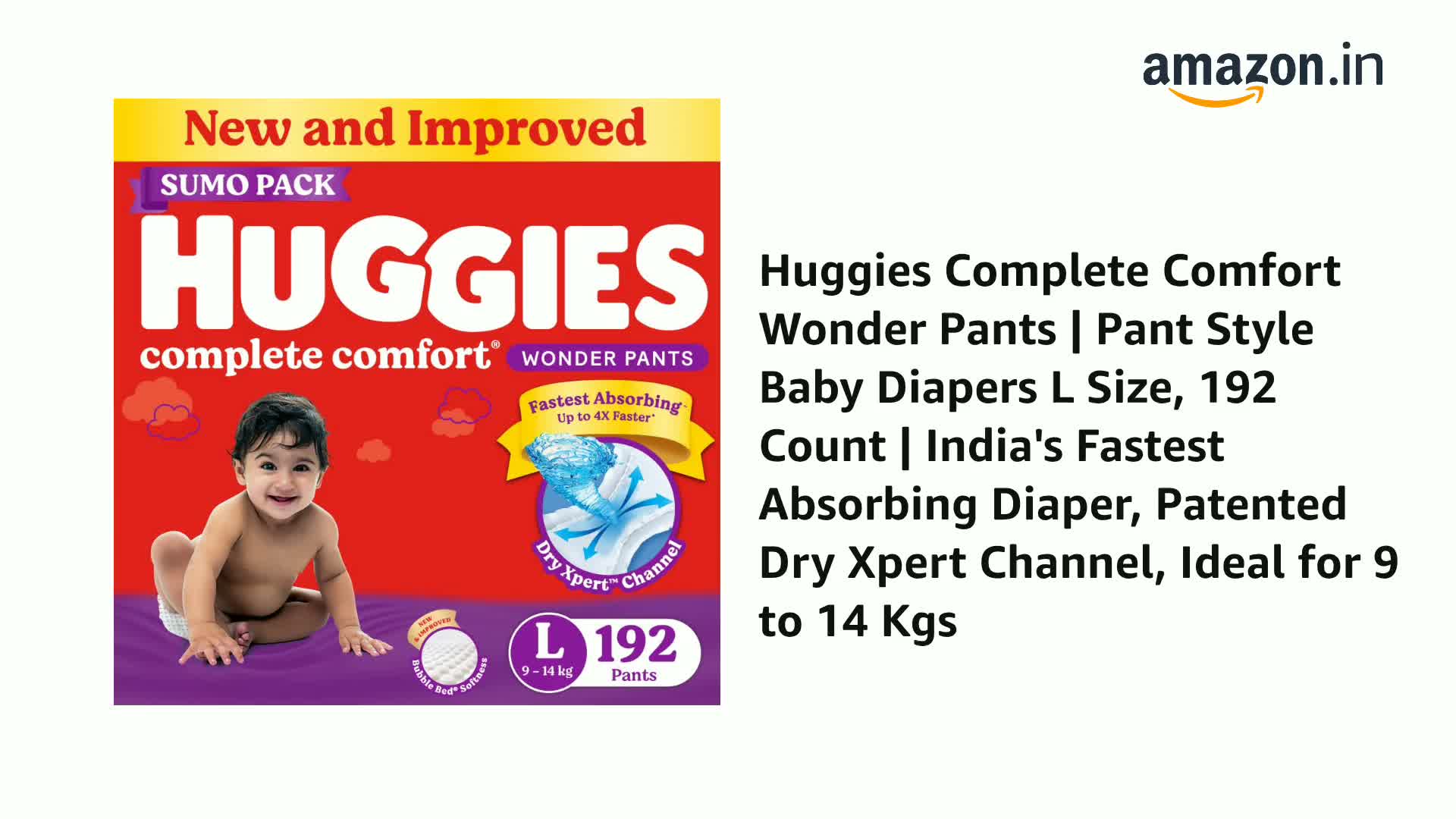 Introducing the New and Improved Huggies Complete Comfort Wonder Pants - India's Fastest Absorbing Diaper. Designed to provide maximum comfort and absorbency for your little one these are our best ever diaper pants. With our patented Dry Xpert technology that spreads urine evenly across the diaper - these diaper pants are now up to 4x Faster in absorbing urine ensuring your baby stays dry and comfortable. But that's not all! Our diaper pants also feature India's 1st Bubble Bed technology that provides a soft inner bubble layer to wrap your baby in ultimate softness. Made from air-friendly breathable material these pants help your baby's skin breathe keeping them comfortable throughout the day protecting them from rashes. And with up to 12 hours of overnight absorption you can both have a peaceful night's sleep. We understand how important it is to keep your baby dry at all times which is why our diaper pants come with double leak guard protection. This extra padding helps prevent thigh leakage ensuring there are no messes to deal with. Choose from a range of sizes of our Pant Style Diapers - including diapers New born /XS size diapers S size (small) diapers M size (medium) diapers L size (large) diapers XL size (extra large) diapers XXL size (double extra large) and diapers XXXL size (triple extra large) - making it suitable for babies of all ages and sizes. Trust Huggies Complete Comfort Wonder Pants for complete care and protection for your little one. Add the new and improved Huggies Complete Comfort Wonder Pants to your shopping cart today! Available on Amazon.
