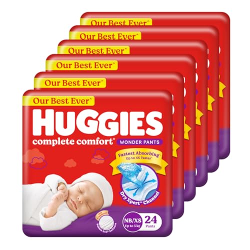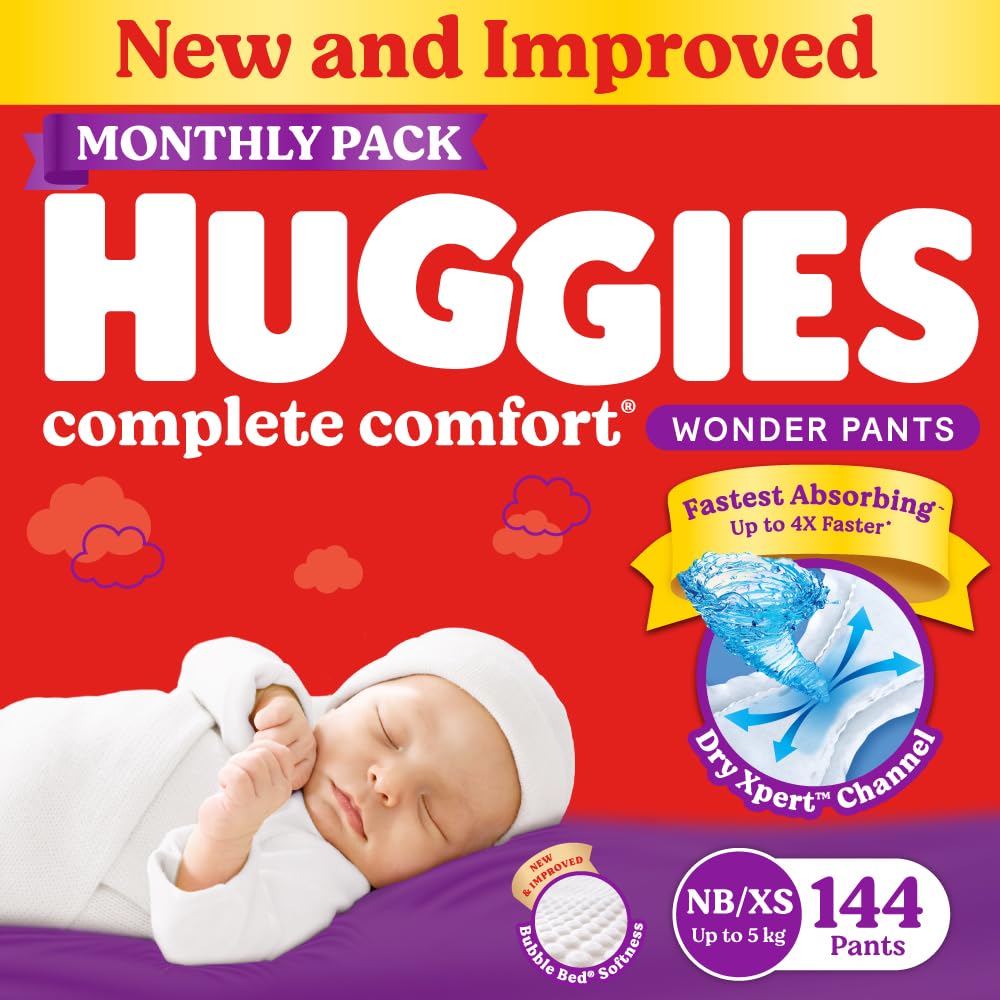 Huggies Complete Comfort Wonder Pants | Pant Style Baby Diapers New Born/XS Size, 144 Count | India's Fastest Absorbing Diaper, Patented Dry Xpert Channel, Ideal for 0-5 Kgs