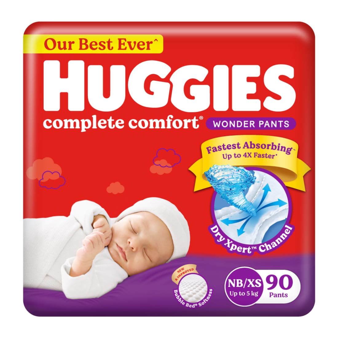 Huggies Complete Comfort Wonder Pants | Pant Style Baby Diapers New Born / XS Size, 90 Count | India's Fastest Absorbing Diaper, Patented Dry Xpert Channel, Ideal for 0-5 Kgs