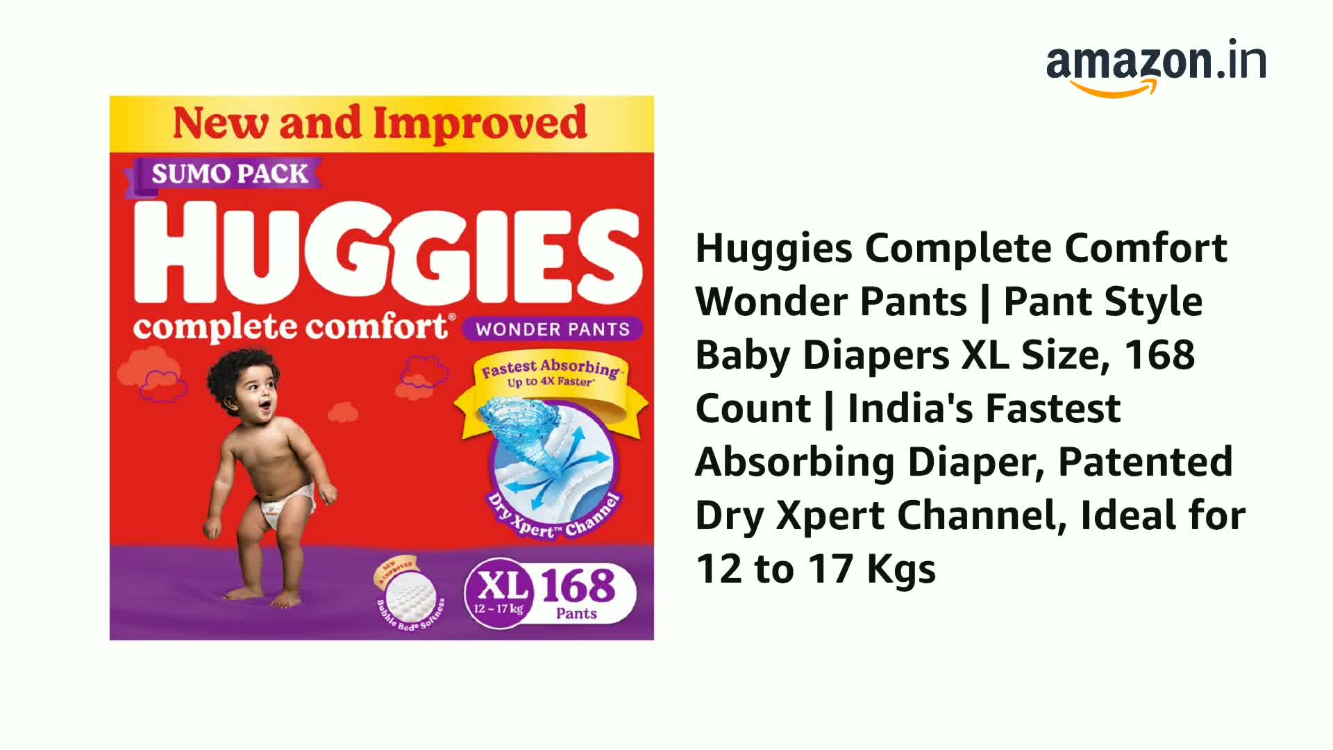 Introducing the New and Improved Huggies Complete Comfort Wonder Pants - India's Fastest Absorbing Diaper. Designed to provide maximum comfort and absorbency for your little one these are our best ever diaper pants. With our patented Dry Xpert technology that spreads urine evenly across the diaper - these diaper pants are now up to 4x Faster in absorbing urine ensuring your baby stays dry and comfortable. But that's not all! Our diaper pants also feature India's 1st Bubble Bed technology that provides a soft inner bubble layer to wrap your baby in ultimate softness. Made from air-friendly breathable material these pants help your baby's skin breathe keeping them comfortable throughout the day protecting them from rashes. And with up to 12 hours of overnight absorption you can both have a peaceful night's sleep. We understand how important it is to keep your baby dry at all times which is why our diaper pants come with double leak guard protection. This extra padding helps prevent thigh leakage ensuring there are no messes to deal with. Choose from a range of sizes of our Pant Style Diapers - including diapers New born /XS size diapers S size (small) diapers M size (medium) diapers L size (large) diapers XL size (extra large) diapers XXL size (double extra large) and diapers XXXL size (triple extra large) - making it suitable for babies of all ages and sizes. Trust Huggies Complete Comfort Wonder Pants for complete care and protection for your little one. Add the new and improved Huggies Complete Comfort Wonder Pants to your shopping cart today! Available on Amazon.