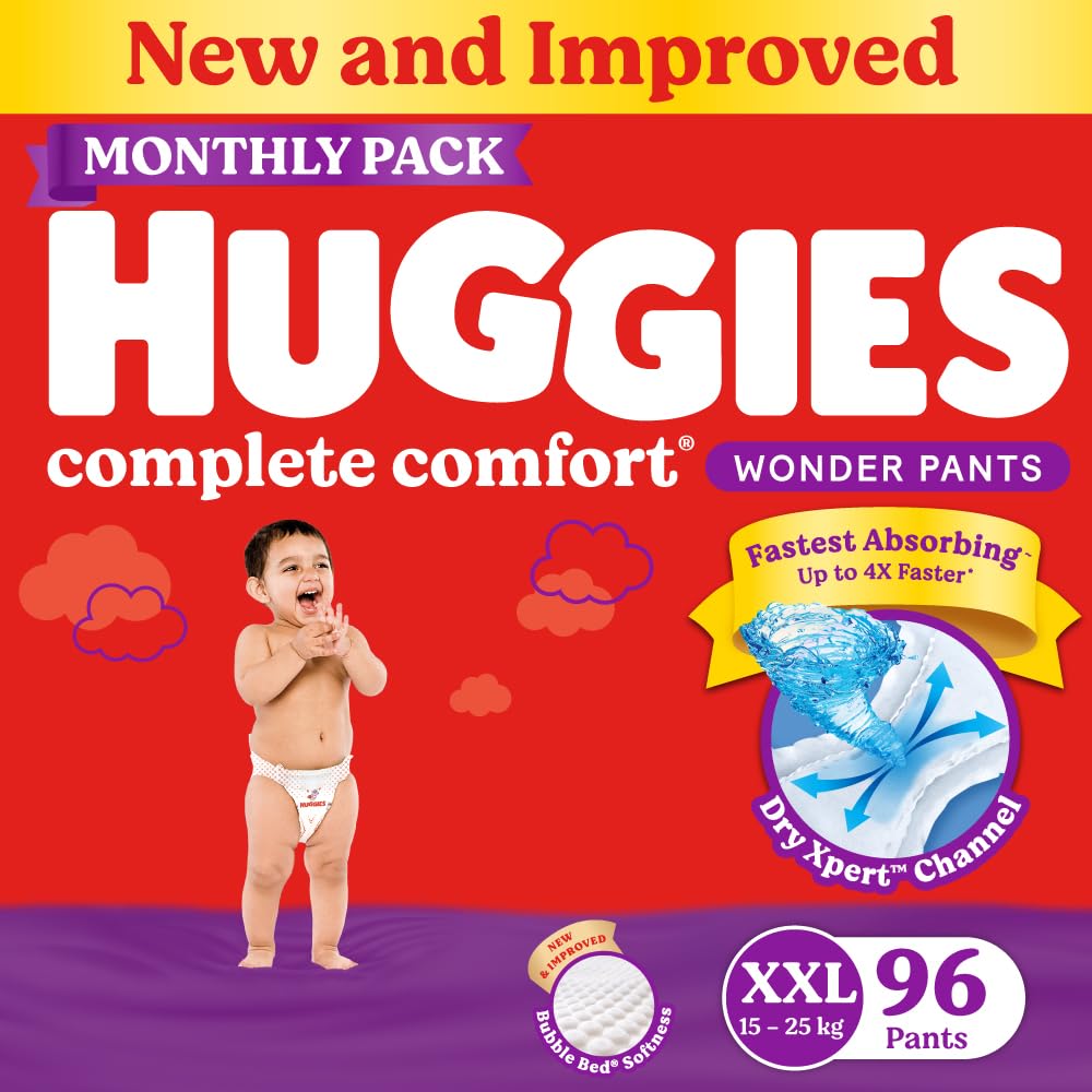 New & Improved Huggies Complete ComfortTM Wonder Pants is India's Fastest Absorbing diaper*. Our best ever^ Diaper Pants absorb upto 4x faster~ now with Dry XpertTM X shaped channel which helps to distribute the urine quickly and evenly to keep your baby dry and comfy. With India's 1st Diaper Pants with Bubble Bed technology Huggies provides a soft inner bubble layer that wraps your baby in softness. Made from air friendly material our diaper pants help your baby's skin to breathe#. Up to 12 Hours of Overnight Absorption@ allows you and your baby to have a comfortable sleep. Double leak guard provides extra padding to fight leakage. Our Pant style diapers are available in all sizes from Newborn/XS S M L XL XXL and XXXL sizes.