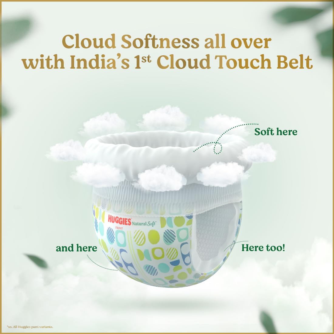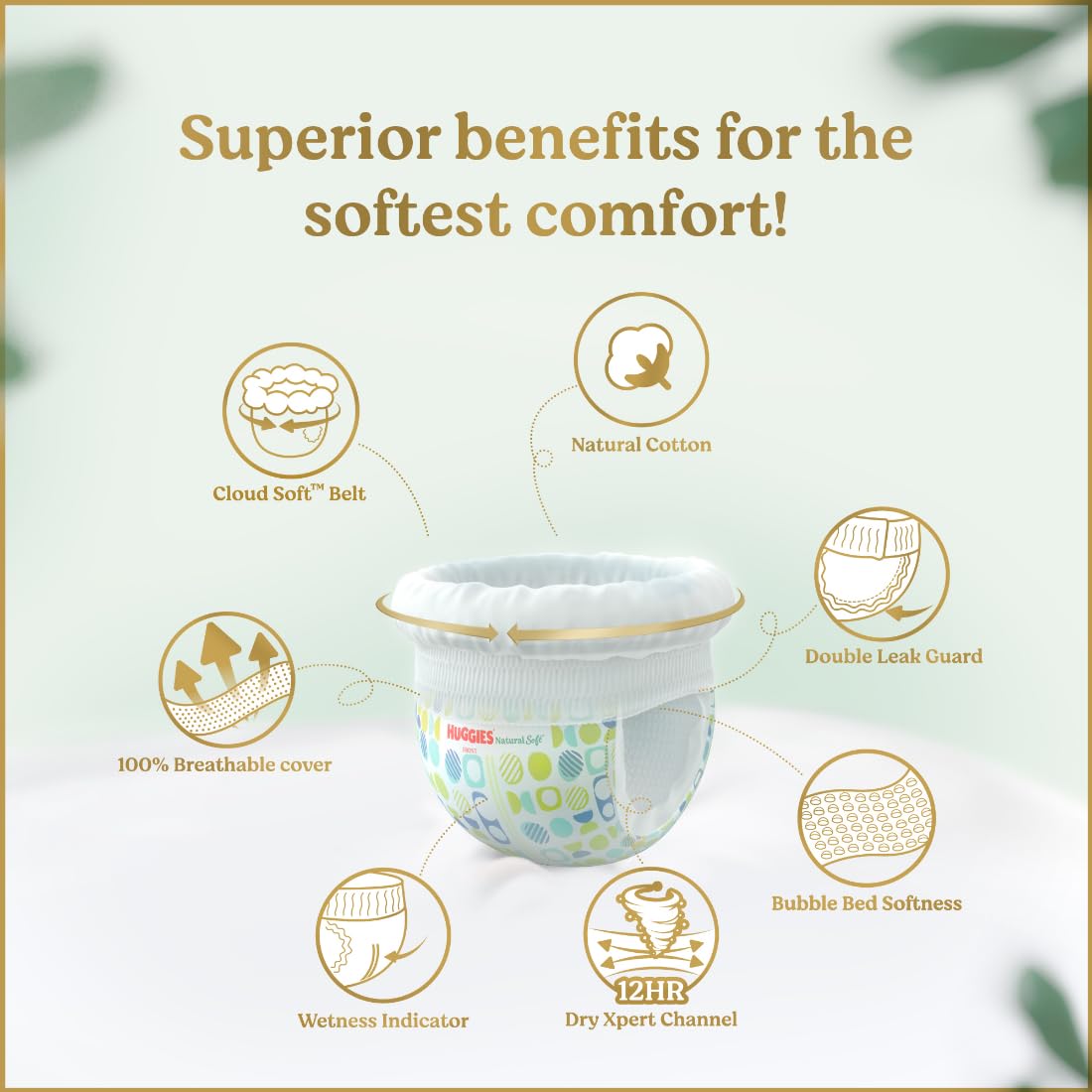 Introducing the new Huggies Natural Soft⢠Our New Premium Soft Pants with India's 1st Cloud Touch Belt TechnologyTM. With Cloud like softness all over it wraps your little one's delicate skin in our softest embrace. Our patented Cloud Touch BeltTM around the waist is made with ultra soft materials that reduces elastic pressure on baby's skin and helps prevent red marks on the skin. The cloud soft bubble bed liner and outer cover cushions baby's skin gently ensuring the softest fit for the baby. Inspired by nature our premium diaper contains carefully selected & 100% imported natural cotton liner for the most gentle care. It comes with India's fastest absorbing Dry Xpert ChannelsTM patented technology which absorbs 4 times faster than regular diapers and absorbs for up to 12 hours ensuring uninteruppted sleep for both you and the baby. The double leak guards on the sides help prevent leakage giving the baby the most comfortable in-wear experience. Our 100% breathable cover enables the skin to breathe and thus helps prevent diaper rashes for ultimate comfort on baby's skin. It also comes with a wetness indictor that turns blue from yellow helping moms with suggestive diaper changing time.  Huggies Natural Soft is available across XS-XXL sizes in cutest prints for your lil'one to be the showstopper that they are. Try the premium range from Huggies with Huggies Natural Soft today. Our softest for your softest.  Usage Instructions: Pull the diaper pants up from baby's legs. After fully used tear diaper from the sides and remove.