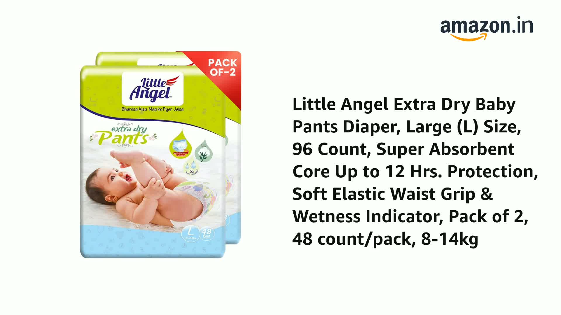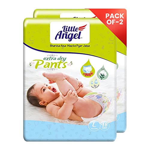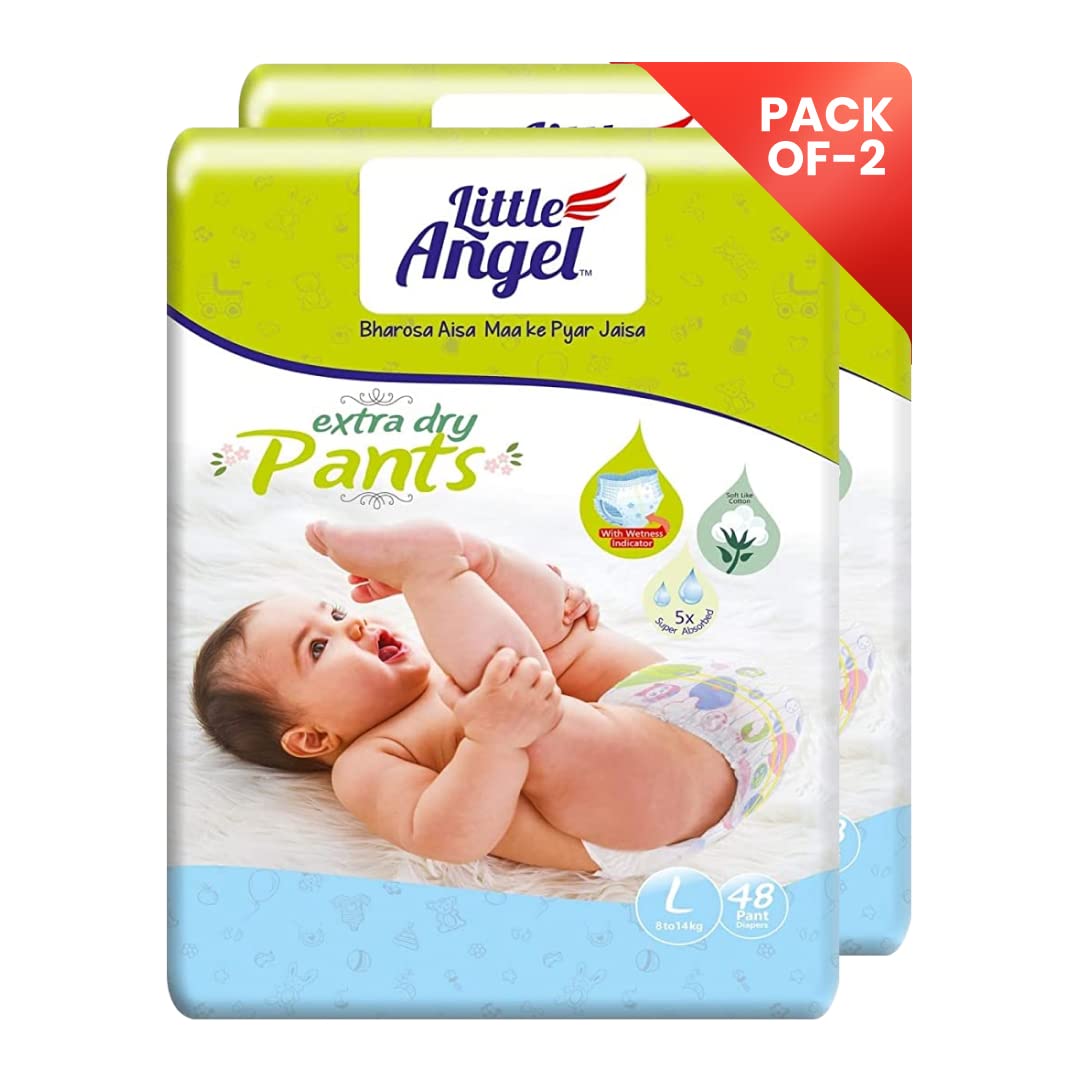 Little Angel Extra Dry Baby Pants Diaper, Large (L) Size, 96 Count, Super Absorbent Core Up to 12 Hrs. Protection, Soft Elastic Waist Grip & Wetness Indicator, Pack of 2, 48 count/pack, 8-14kg