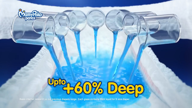 Best 12 hours absorbent pants ever in MamyPoko product history in India has +60% Deep Absorbent CrissCrosswith extra 3rd layer that absorbs urine deeply and provides 2x protection for thigh leakage without sogginess whole night so baby & mother can sleep deeply whole night".