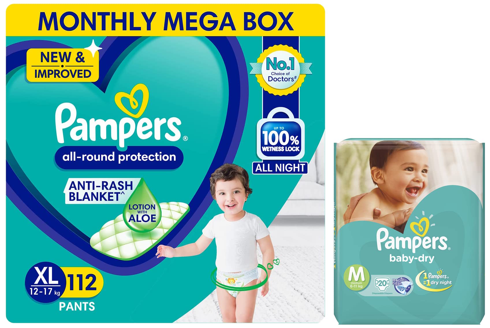 Pampers All round Protection Pants Extra Large size baby Diapers (XL) 112 Count Lotion with Aloe VeraNEW IMPROVED Pampers all round protection pants have ANTI RASH BLANKET* containing Lotion with Aloe Vera to keep your baby’s skin protected from redness and rashes. Top quality diaper pants with Up to 100% WETNESS LOCK keeps the pee locked inside and baby's bum stays dry for ALL NIGHT. Air channels & stretchy belt provides your baby breathable airy fit comfortable even in summers. Pampers unique Magic gel technology provides up to 12 hours of dryness and has up to 2X faster absorption The new and improved design has an EXTRA SOFT material and a fit that adapts to baby’s movements for best comfort. Available in all sizes Small diapers medium diaper pants large size diaper pants XL diapers XXL diapers XXXL diaper pants. Our pants with fun exterior graphics fun designs of characters and a delightful fresh Aloe fragrance ensures you enjoy every change with your baby (*Blanket refers to soft topsheet with lotion Helps prevent rash due to wetness after 1 day of usage based on clinical studies in USA 2000 2019)Pampers Taped Diapers Medium (MD) 20 countNEW & IMPROVED Pampers all-round protection pants have ANTI-RASH BLANKET* containing Lotion with Aloe Vera to keep your baby’s skin protected from redness irritation and rashes. quality diapers with 100% WETNESS LOCK keeps the pee locked inside & baby's bum stays dry for ALL NIGHT. Air channels & stretchy belt provides your baby breathable airy fit - comfortable even in summers. Pampers unique Magic gel technology provides up to 12 hours of dryness – and has 2X faster absorption. The new and improved product design enables a comfortable fit closer to the baby’s body and an EXTRA SOFT flexible waist band that adapts to baby’s movements for best comfort. Available in all sizes – Small diapers medium diaper pants large size diaper pants XL diapers XXL diapers XXXL diaper pants. A top layer with cotton-like soft material ensure a comfortable night’s sleep. Our pants with fun exterior graphics fun designs of characters and a delightful fresh Aloe fragrance ensures you enjoy every change with your baby. (*Blanket refers to soft topsheet with lotion. Helps prevent rash due to wetness after 1 day of usage based on clinical studies in USA 2000-2019).