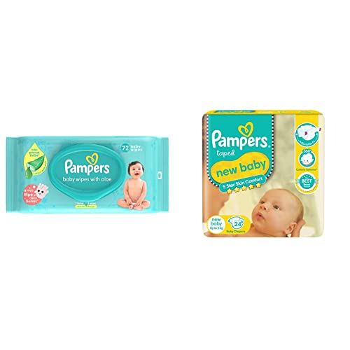 Pampers Active Baby Diapers New Born Extra Small (NB XS) size 24 Count Taped style diaper5 Star Skin Protection: The Best tape style diapers from Pampers with an outer layer of cotton-like softness this baby diaper provides intense care to your baby's sensitive skin and protects it effectively from friction rash and redness. These soft and comfort fitting diapers with stretchable sides are best for your baby's rest and playtime. The diaper's fastening tape sticks multiple times thus ensuring it stays in place even after you fasten it after checking your baby's diaper. Protection and nourishment of your baby's skin are taken care of with extracts of moisturizing Aloe Vera lotion characteristic of these best baby diapers.. These diapers are ultra-thin thanks to the absorbent gel material (AGM) commonly known as Magic Gel. This magic gel core of Pampers diapers is highly effective in absorbing frequent wetness. Naturally your baby's skin remains dry for upto 12 hours now no more frequent diaper changing or blow leaks for your little angel.Pampers Baby Aloe Wipes with Lid 72 WipesEvery little miracle deserves gentle protection mothers & doctors have always trusted Pampers to provide the care. Presenting Pampers Baby Wipes with Aloe which have the goodness of lotion with Aloe vera to protect against skin rashes & redness. Containing 97% pure water Pampers Wipes provide mild cleaning for baby supples skin just like cotton & water. Pampers wipes are safe as they are paraben-free and infused with Vitamin-E. They help restore the natural pH of your baby skin keeping it healthy and nourished. Pampers wipes are thick soft and strong ensuring a perfect gentle cleaning for the baby skin. Lastly the wipes come with a refreshing mild fragrance that you and your baby will surely love. Wet wipes tissues with lid 72 pcs combo pack.
