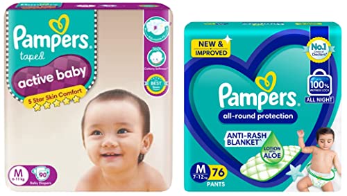Pampers Active Baby Taped Diapers Medium size diapers (MD) 90 count taped style custom fit5 Star Skin Protection: The Best tape style diapers from Pampers with an outer layer of cotton-like softness this baby diaper provides intense care to your baby's sensitive skin and protects it effectively from friction rash and redness. These soft and comfort fitting diapers with stretchable sides are best for your baby's rest and playtime. The diaper's fastening tape sticks multiple times thus ensuring it stays in place even after you fasten it after checking your baby's diaper. Protection and nourishment of your baby's skin are taken care of with extracts of moisturizing Aloe Vera lotion characteristic of these best baby diapers.. These diapers are ultra-thin thanks to the absorbent gel material (AGM) commonly known as Magic Gel. This magic gel core of Pampers diapers is highly effective in absorbing frequent wetness. Naturally your baby's skin remains dry for upto 12 hours now no more frequent diaper changing or blow leaks for your little angel.Pampers All round Protection Pants Medium size baby diapers (M) 76 Count Lotion with Aloe VeraNEW & IMPROVED Pampers all-round protection pants have ANTI-RASH BLANKET* containing Lotion with Aloe Vera to keep your baby’s skin protected from redness irritation and rashes. Best quality diapers with 100% WETNESS LOCK keeps the pee locked inside & baby's bum stays dry for ALL NIGHT. Air channels & stretchy belt provides your baby breathable airy fit - comfortable even in summers. Pampers unique Magic gel technology provides up to 12 hours of dryness – and has 2X faster absorption. The new and improved product design enables a comfortable fit closer to the baby’s body and an EXTRA SOFT flexible waist band that adapts to baby’s movements for best comfort. Available in all sizes – Small diapers medium diaper pants large size diaper pants XL diapers XXL diapers XXXL diaper pants. A top layer with cotton-like soft material ensure a comfortable night’s sleep. Our pants with fun exterior graphics fun designs of characters and a delightful fresh Aloe fragrance ensures you enjoy every change with your baby. (*Blanket refers to soft topsheet with lotion. Helps prevent rash due to wetness after 1 day of usage based on clinical studies in USA 2000-2019).